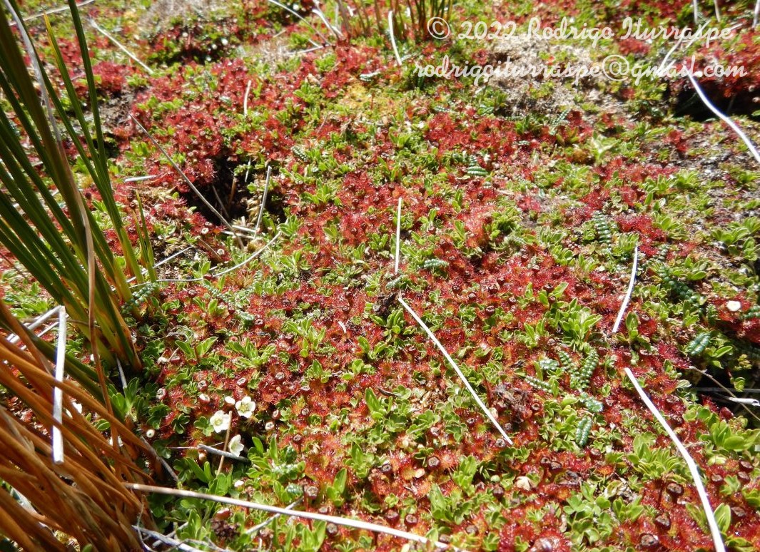 Hierba acaulescente hasta de 2,5 cm de alto, formando hibernáculo en el invierno. Hojas en roseta, adpresas al suelo cuando jóvenes y luego patentes, láminas espatuladas, de 2-5 × 2,5-6 mm, ápice obtuso, márgenes y cara adaxial con emergencias glandulares (tentáculos) rojos, superficie abaxial glabra; peciolos de 3-6,5 × 1-1,8 mm, bien diferenciados de la lámina, glabros; estípulas ausentes o reducidas a setas laterales. Inflorescencias 1(-2-3) por planta, de 4,5-12 mm de largo, 1-floras; pedúnculos de 3-10 mm de largo, glabros; brácteas ausentes; pedicelos vinosos. Flores con sépalos cortamente espatulados, de 2,5-4 × 2-3,5 mm, fuertemente cóncavos, a veces levemente crenulados, glabros, rojo vinosos; pétalos obovados a unguiculados, de 3-6,5 × 2-4,2 mm, blancos, a veces rojizos o verdosos en la base; estambres de 2-3 mm de largo; ovario 3-5-carpelar, de 1,5-2,5 mm, con 3-5 estilos multipartidos desde la base, estigmas multipartidos. Semillas obovoideas a elipsoides, de 0,5-0,8 mm de largo, castaño oscuras, reticuladas.