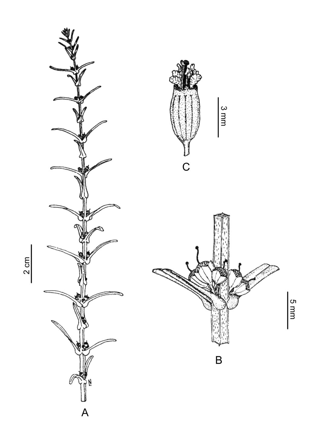 A. Rama florífera. B. Detalle del nudo. C. Flor. Tomado de Aportes Bot. Salta. Ser. Flora 2(23): fig. 3 h-k.