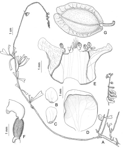 Arbustos bajos a hierbas de 18-55 cm de alto; tallos con pubescencia de tricomas estrigosos menores a 0,5 mm de largo. Hojas alternas; pecíolos de 0,8-1 mm de largo, pubérulos; láminas lineares a estrechamente oblongas, de 12-25 × 0,8-7,2 mm, ápice truncado, emarginado a 2-lobado, pubérulas. Inflorescencias de 1,8-3 cm de largo, luego de fructificar de 12-17 cm de largo; raquis pubérulo, con nectarios extraflorales evidentes a los costados de la inserción del pedicelo; brácteas triangulares, de 2,2-2,4 mm de largo, pubescentes; bractéolas de menor tamaño. Flores de 4-5 mm de largo, violáceas a rosadas, el ápice amarillento; pedicelo ca. 1 mm de largo; sépalos externos pubescentes en su cara abaxial y márgenes; sépalo externo inferior ovado, ca. 1,5 × 1,1 mm, ápice obtuso; sépalos externos superiores ovados, ca. 1,2 × 1 mm, ápice obtuso; sépalos internos “alas” elípticos, ca. 4 × 2,5 mm, ápice obtuso, glabros o ciliados; quilla 3-lobulada , ca. 3,5 mm de largo, pétalos laterales ca. 3,5 mm de largo, ápice obtuso, pubescentes en la porción media adaxial, fusionados con la vaina estaminal; estambres 8, vaina estaminal ca. 2 mm de largo, porción libre de los filamentos estaminales separados entre sí en grupos de cuatro por una barra pubescente; ovario de contorno oblongo, ca. 1,3 × 0,8 mm, pubescente; estilo curvo, de 1,5-2 mm de largo, ensanchado distalmente, auriculado, glabro, área estigmática con el lóbulo estéril agudo, lóbulo fértil 1-tuberculado. Fruto samaroide elipsoide, ca. 9 × 6 mm, asimétrico, pubescente. Semilla 1.