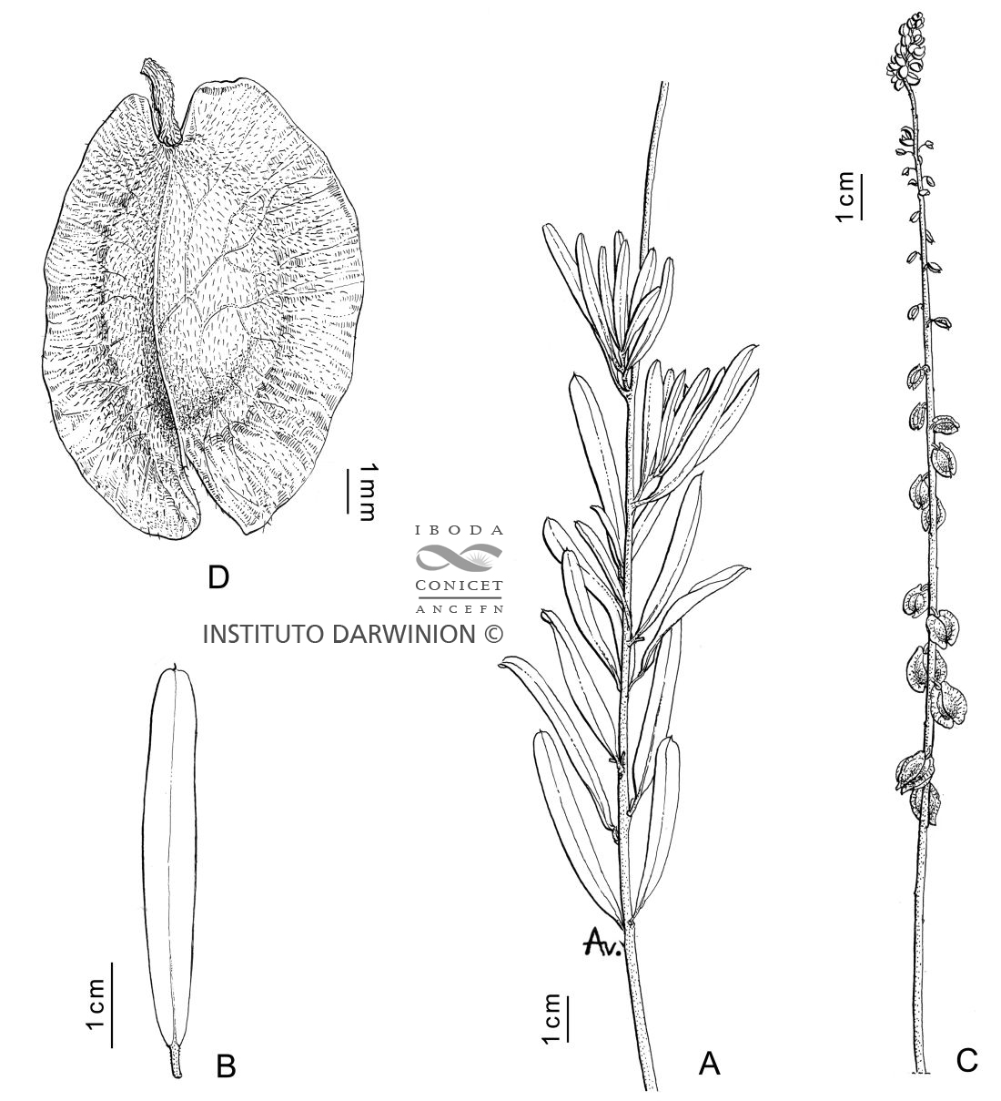 Arbustos bajos a hierbas de 18-55 cm de alto; tallos con pubescencia de tricomas estrigosos menores a 0,5 mm de largo. Hojas alternas; pecíolos de 0,8-1 mm de largo, pubérulos; láminas lineares a estrechamente oblongas, de 12-25 × 0,8-7,2 mm, ápice truncado, emarginado a 2-lobado, pubérulas. Inflorescencias de 1,8-3 cm de largo, luego de fructificar de 12-17 cm de largo; raquis pubérulo, con nectarios extraflorales evidentes a los costados de la inserción del pedicelo; brácteas triangulares, de 2,2-2,4 mm de largo, pubescentes; bractéolas de menor tamaño. Flores de 4-5 mm de largo, violáceas a rosadas, el ápice amarillento; pedicelo ca. 1 mm de largo; sépalos externos pubescentes en su cara abaxial y márgenes; sépalo externo inferior ovado, ca. 1,5 × 1,1 mm, ápice obtuso; sépalos externos superiores ovados, ca. 1,2 × 1 mm, ápice obtuso; sépalos internos “alas” elípticos, ca. 4 × 2,5 mm, ápice obtuso, glabros o ciliados; quilla 3-lobulada , ca. 3,5 mm de largo, pétalos laterales ca. 3,5 mm de largo, ápice obtuso, pubescentes en la porción media adaxial, fusionados con la vaina estaminal; estambres 8, vaina estaminal ca. 2 mm de largo, porción libre de los filamentos estaminales separados entre sí en grupos de cuatro por una barra pubescente; ovario de contorno oblongo, ca. 1,3 × 0,8 mm, pubescente; estilo curvo, de 1,5-2 mm de largo, ensanchado distalmente, auriculado, glabro, área estigmática con el lóbulo estéril agudo, lóbulo fértil 1-tuberculado. Fruto samaroide elipsoide, ca. 9 × 6 mm, asimétrico, pubescente. Semilla 1.