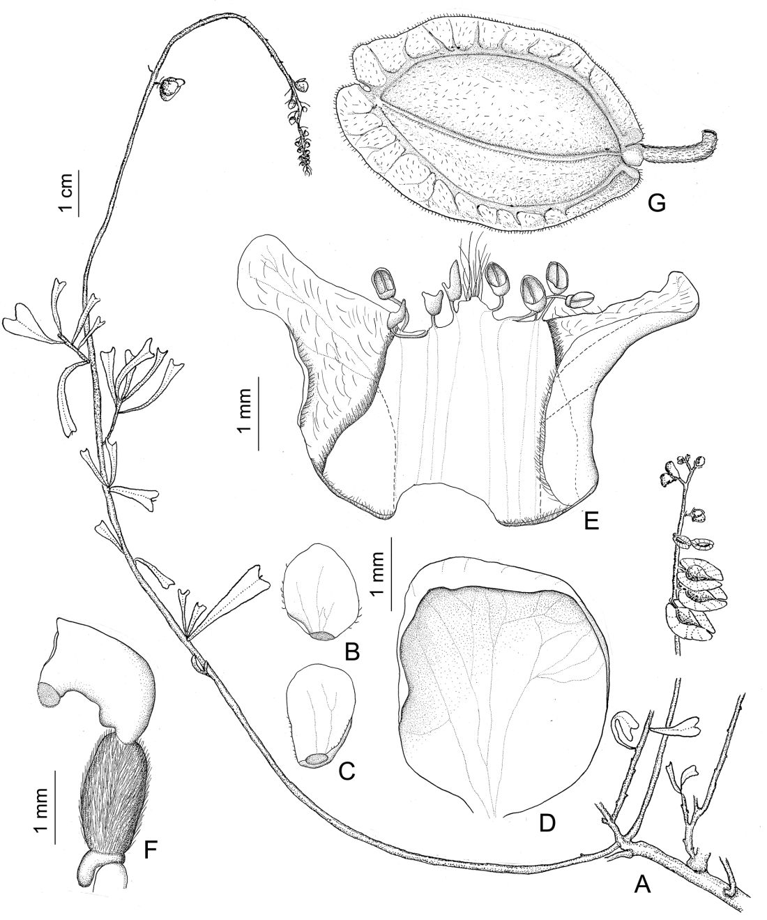 Arbustos bajos a hierbas de 18-55 cm de alto; tallos con pubescencia de tricomas estrigosos menores a 0,5 mm de largo. Hojas alternas; pecíolos de 0,8-1 mm de largo, pubérulos; láminas lineares a estrechamente oblongas, de 12-25 × 0,8-7,2 mm, ápice truncado, emarginado a 2-lobado, pubérulas. Inflorescencias de 1,8-3 cm de largo, luego de fructificar de 12-17 cm de largo; raquis pubérulo, con nectarios extraflorales evidentes a los costados de la inserción del pedicelo; brácteas triangulares, de 2,2-2,4 mm de largo, pubescentes; bractéolas de menor tamaño. Flores de 4-5 mm de largo, violáceas a rosadas, el ápice amarillento; pedicelo ca. 1 mm de largo; sépalos externos pubescentes en su cara abaxial y márgenes; sépalo externo inferior ovado, ca. 1,5 × 1,1 mm, ápice obtuso; sépalos externos superiores ovados, ca. 1,2 × 1 mm, ápice obtuso; sépalos internos “alas” elípticos, ca. 4 × 2,5 mm, ápice obtuso, glabros o ciliados; quilla 3-lobulada , ca. 3,5 mm de largo, pétalos laterales ca. 3,5 mm de largo, ápice obtuso, pubescentes en la porción media adaxial, fusionados con la vaina estaminal; estambres 8, vaina estaminal ca. 2 mm de largo, porción libre de los filamentos estaminales separados entre sí en grupos de cuatro por una barra pubescente; ovario de contorno oblongo, ca. 1,3 × 0,8 mm, pubescente; estilo curvo, de 1,5-2 mm de largo, ensanchado distalmente, auriculado, glabro, área estigmática con el lóbulo estéril agudo, lóbulo fértil 1-tuberculado. Fruto samaroide elipsoide, ca. 9 × 6 mm, asimétrico, pubescente. Semilla 1.
