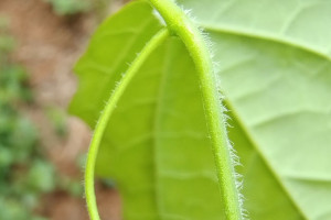 Liana de 4-6 m de alto, ramas estriadas con lenticelas circulares o elípticas de 0,3-0,4 mm de largo, ramas jóvenes pubérulas, nudos con campos glandulares y línea interpeciolar; profilos de las yemas axilares angustiovados, acuminados, de 1,8-3 × 0,4-0,8 mm. Hojas bifolioladas o con zarcillo terminal trigarfiado, pecíolo de 1-2,7 cm de largo, peciólulos de 6-30 mm de largo, ambos con micropelos y pelos simples de 0,4-0,6 mm de largo; folíolos ovados, de 4-8,3(-9) × 1,7-5,5 cm, cartáceos, irregularmente dentados, ápice agudo o acuminado, haz glabra, envés con pelos glandulares sésiles dispersos, algunos nectarios en la mitad basal, venas principales pilosas, venación menor visible sólo en el envés. Flores axilares solitarias, pedicelos de 3,5-4,5 cm de largo, bractéolas sésiles, elípticas, apiculadas, de 5- 18 × 1-5 mm; cáliz algo inflado, espatiforme, de 1,5-3 cm de largo, con un diente dorsal, salpicado con escamas y tricomas glandulares diminutos estipitados; corola tubulosa, amarillo vivo o pálido, de 5-7,5 × 2,5-4 cm, con tricomas glandulares diminutos esparcidos, lóbulos amarillos, de 1,3-1,8 cm de diám.; estambres inclusos, conectivo obtuso, tecas divergentes; disco de 1,5-2 mm de largo, ovario cilíndrico, de 5-6 mm de largo. Cápsulas septicidas, lineares u oblongo-lineares, negruzcas, de 15-33 × 1,5-2 cm. Semillas elípsoides, gruesas, de 10-11 × 15-18 × 2-3 mm, pardo-oscuras, alas angostas, de 1-2 mm de largo, bordes membranáceos, hialinos.