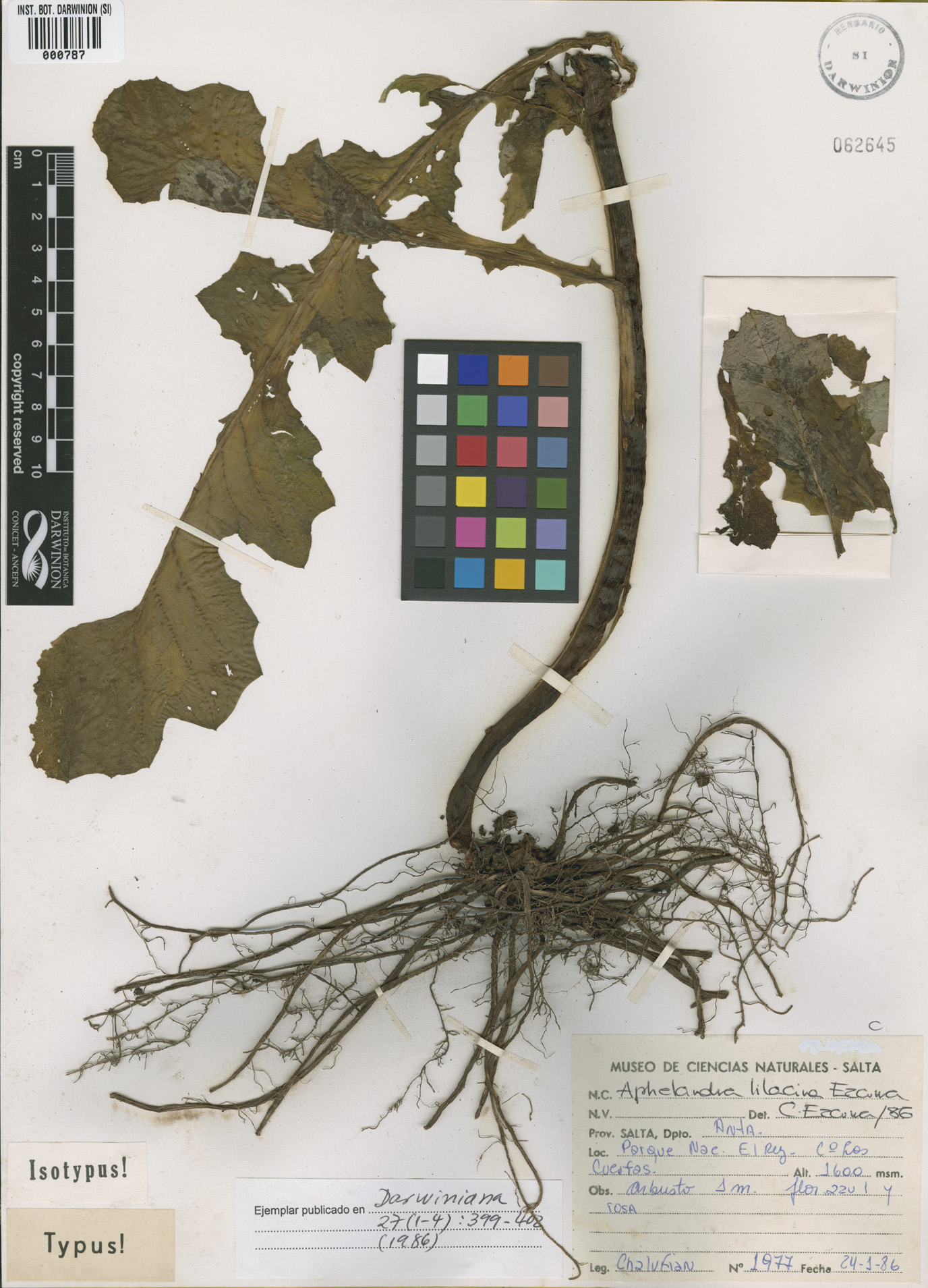 Observaciones: Esta especie se caracteriza por sus flores de color lila y sus grandes hojas dentado-lobadas, y parece ser un endemismo restringido a serranías del norte de la Argentina. Se asemeja a Aphelandra kolobantha Lindau del centro de Bolivia, pero se diferencia por las brácteas con dientes menos