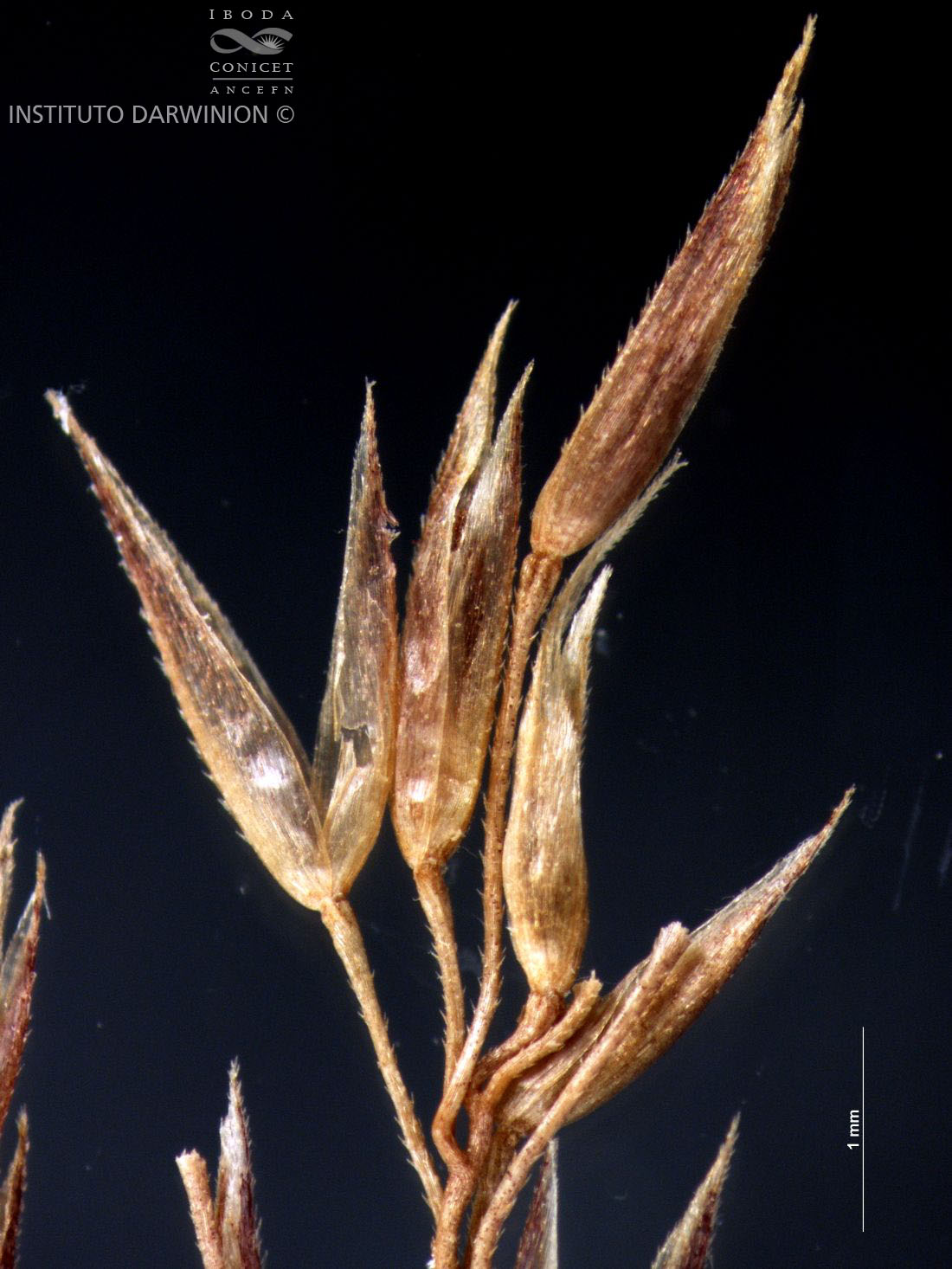 Hierbas perennes, cespitosas; cañas erectas de 30-50 cm de alto; césped con pocas innovaciones estériles; vainas glabras o escabriúsculas; ligulas ca. 2 mm de largo, agudas, ápice obtuso, denticulado; láminas planas o subconvolutas. Inflorescencia de 5-12 cm de largo, ramificaciones erectas, contraídas, pluriespiculadas, espiguillas aglomeradas hacia el ápice, cada ramificación lleva aproximadamente 15 espiguillas, ramificaciones inferiores desnudas en la base, las medias y superiores pueden ser floríferas hasta la base. Espiguillas generalmente oliváceas; glumas 2, de 2,9-3,2 mm de largo, subiguales, 1-nervias, escabrosas sobre la carina y dorso; callo redondeado con dos mechones laterales de pelos de 0,2-0,3 mm de largo; lemma de 1,8-2,2 mm de largo, 5-nervia, nervios laterales notables en la mitad o tercio superior, nervio medio terminado en arista de 1,2-2 mm de largo, naciendo en el tercio medio del dorso; pálea de 0,25-0,4 mm de largo, ápice redondeado o agudo; estambres 3, anteras de 0,75-0,8 mm de largo; cariopsis de 1,5 mm de largo, fusiforme.