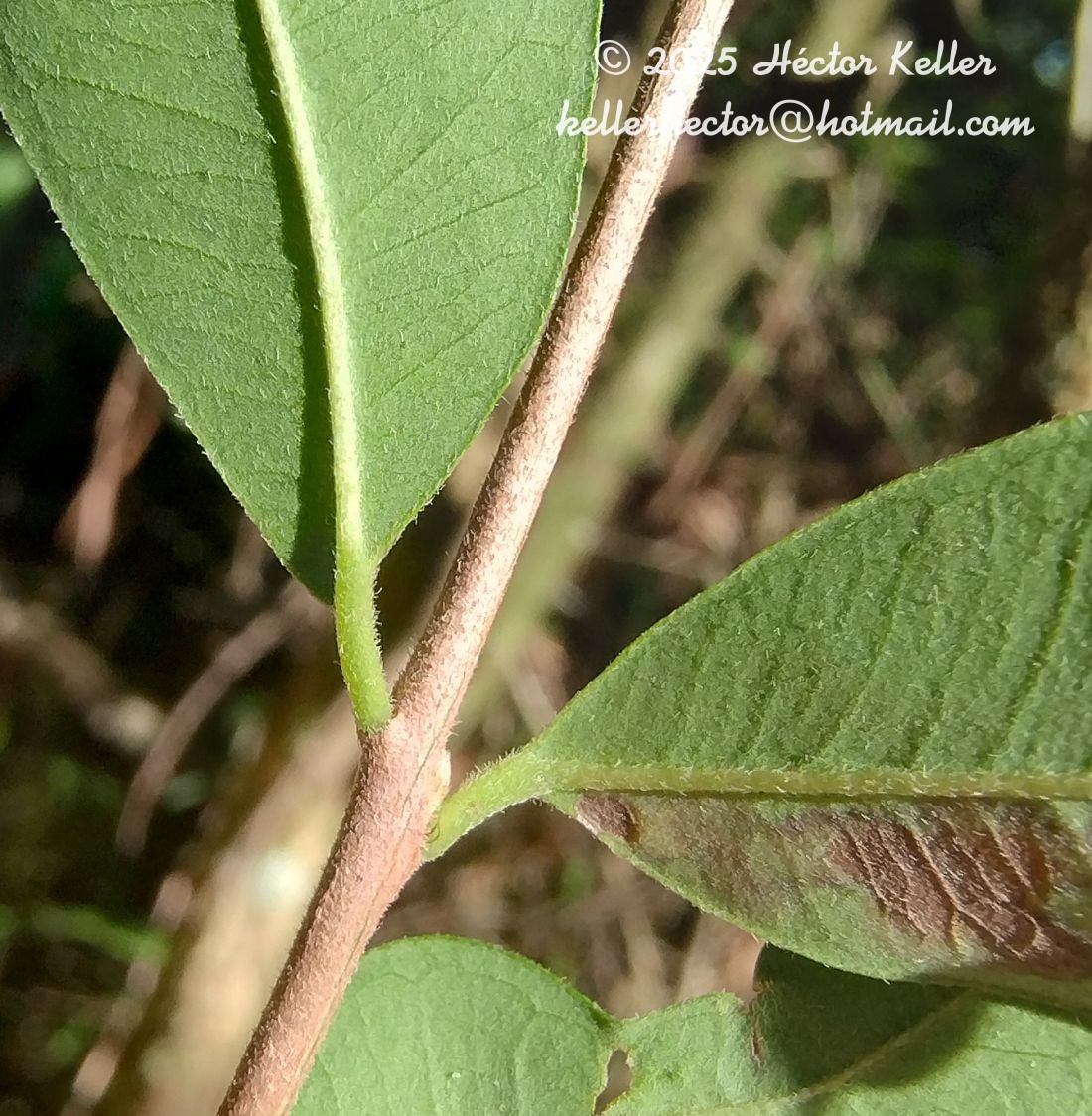 Árbol o arbolito de 2-8 (15) m. Hojas de 2-9 x 0,7-2 cm, elípticas; epifilo glabro o algo pubescente sobre el nervio medio, hipofilo glabrescente a la madurez. Flores 1-7, en dicasios; pedúnculos de 1-4 cm; hipanto seríceo, pubescente sobre la pared locular; sépalos seríceos; pétalos pubescentes; estambres de 5-8 mm; disco estaminal pubescente; estilo pubescente de 5-9 mm. Fruto hasta 1,5 cm, globoso, rojo, piloso.