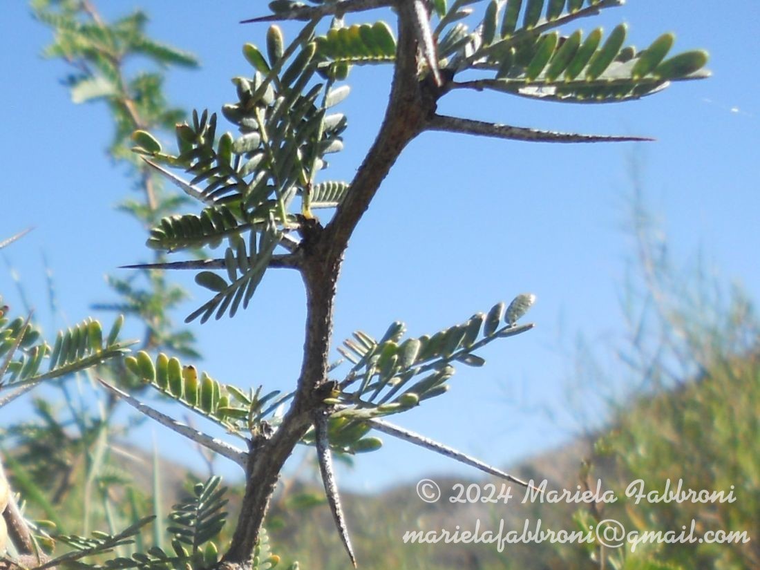Arbusto o pequeño árbol de no más de 3 m de alt., tronco breve, de aprox. 10 cm de diám. Espinas estipulares, de hasta 3,5 cm. Hojas 1-yugadas, pinnas (5)-8-15-(16)-yugadas; folíolos elípticos oblongos, de 1,5-6 x 1-1,5 mm, ligeramente ciliados. Inflorescencias ovoide-elípticas. Flores amarillas. Legumbre espiralada (2-7 vueltas), de 2-4 x 1-1,5 cm, castaña rojiza a la madurez, pubérula, endocarpo segmentado. Semillas ovoides, comprimidas lateralmente de 4-5 x 3 mm.