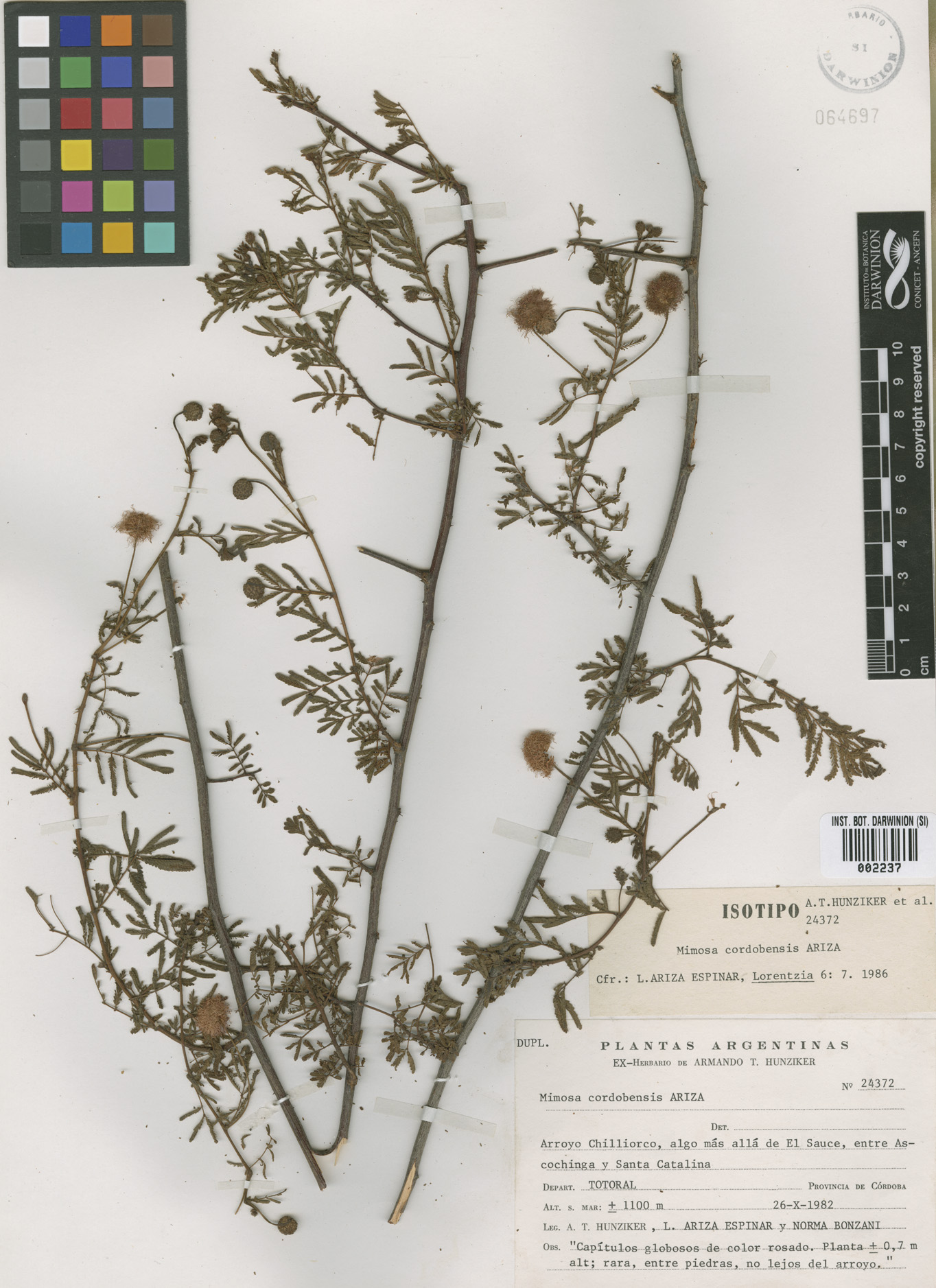 Material Tipo: Argentina. Córdoba. Dpto. Totoral: algo más allá de El Sauce, a orillas del Arroyo Chilliorco, entre Ascochinga y Santa Catalina, 1100 m s.m., 26 Oct 1982, A. T. Hunziker, L. Ariza Espinar & N. E. Bonzani 24372 (CORD 00002915! & CORD 00002916!; isotipos, SI 002237!, SI 002238!).