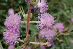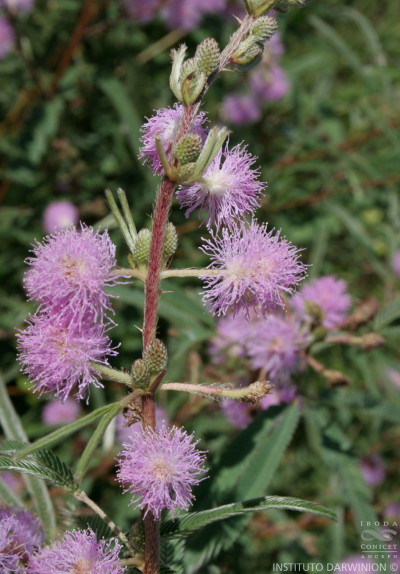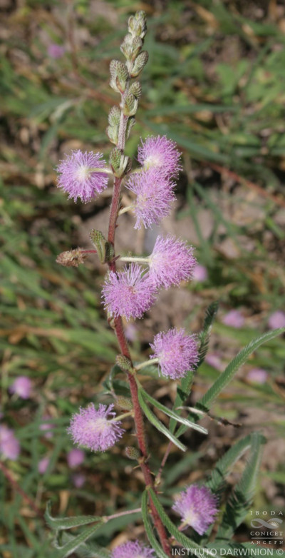 Subarbustos de hasta 2 m alt. Tallos aculeados, con acúleos infrastipulares, híspidos o estrigosos. Hojas con estípulas 1-11-nervadas, de 5-11 x 1-24 mm, coriáceas, persistentes, castañas; pecíolos de 0,5-4 cm de long.; pinnas 1-par; raquis de 3-8 cm; folíolos 1-par, de 6-15 x 1-3mm, glabros o estrigosos en la cara abaxial, 1-3-nervados, castaños, discoloros. Inflorescencias con pedúnculos de 4-20 mm; capítulos de 5-5,5 mm diám., generalmente esferoides. Flores fértiles haplostémonas, con cáliz de 0,5-1 mm, irregularmente paleáceo; corola glabra o pubérula en los lóbulos, rosada, violácea o liliácea. Craspedios de 1-2,5 x 0,4-0,5 cm, híspidos, castaños en herbario.
