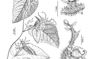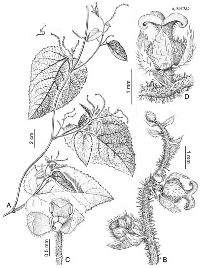 Sufrútice voluble, hasta de 2 m de largo; tallos con entrenudos hasta de 10 cm de largo, con tricomas urticantes, simples patentes y glandulares pedicelados sobre el tallo y ejes de la inflorescencia. Hojas con pecíolo de 2-3,5 cm de largo; estípulas angostamente ovadas, de 2,4 mm de largo, agudas u obtusas, ciliadas, con escasa pubescencia en la cara abaxial; lámina angosta a anchamente ovada, hasta de ca. 10 × 6 cm, no reflexa, aguda, cordada, aserrada, con tricomas simples, tricomas urticantes y escasos tricomas glandulares. Inflorescencias en botrioides hasta de 5 cm de largo, abiertos, multifloros; pedúnculo de 2 cm de largo; eje basal lateral con 1 flor pistilada y eje terminal abierto, hasta de 3-3,5 cm de largo, con ± 25 flores estaminadas, a veces sobre braquiblastos floríferos; bráctea basal lanceolada, ca. 1 mm de largo, entera o 3-partita, las restantes lanceoladas, de 0,6 mm de largo, ambas ciliadas y con escasa pubescencia en el dorso. Flores estaminadas con epipodio ca. 1 mm de largo e hipopodio de menos de 0,5 mm de largo; sépalos 3, elípticos, de 0,8 mm de largo, agudos, pubescentes en el dorso; estambres 3, filamentos cónicos, dilatados en la base, ca. 0,5 mm de largo, anteras de contorno oblongo, de 0,2 mm de largo. Flores pistiladas con pedicelo de 1 mm de largo, articulado en la ½; sépalos 6, elípticos, de 1 mm de largo, pubescentes en el dorso; ovario globoso, de 2 mm de diámetro, con tricomas glandulares pedicelados y tricomas urticantes; estilos unidos en la base, de 1 mm de largo, recurvos en el ápice, superficie estigmática lisa. Fruto con pedicelo de 2 mm de largo, esférico, ca. 6 mm de diámetro, con tricomas urticantes y glandulares, pedicelados. Semillas esféricas, ca. 2 mm de diámetro, superficie seminal con papilas esféricas.