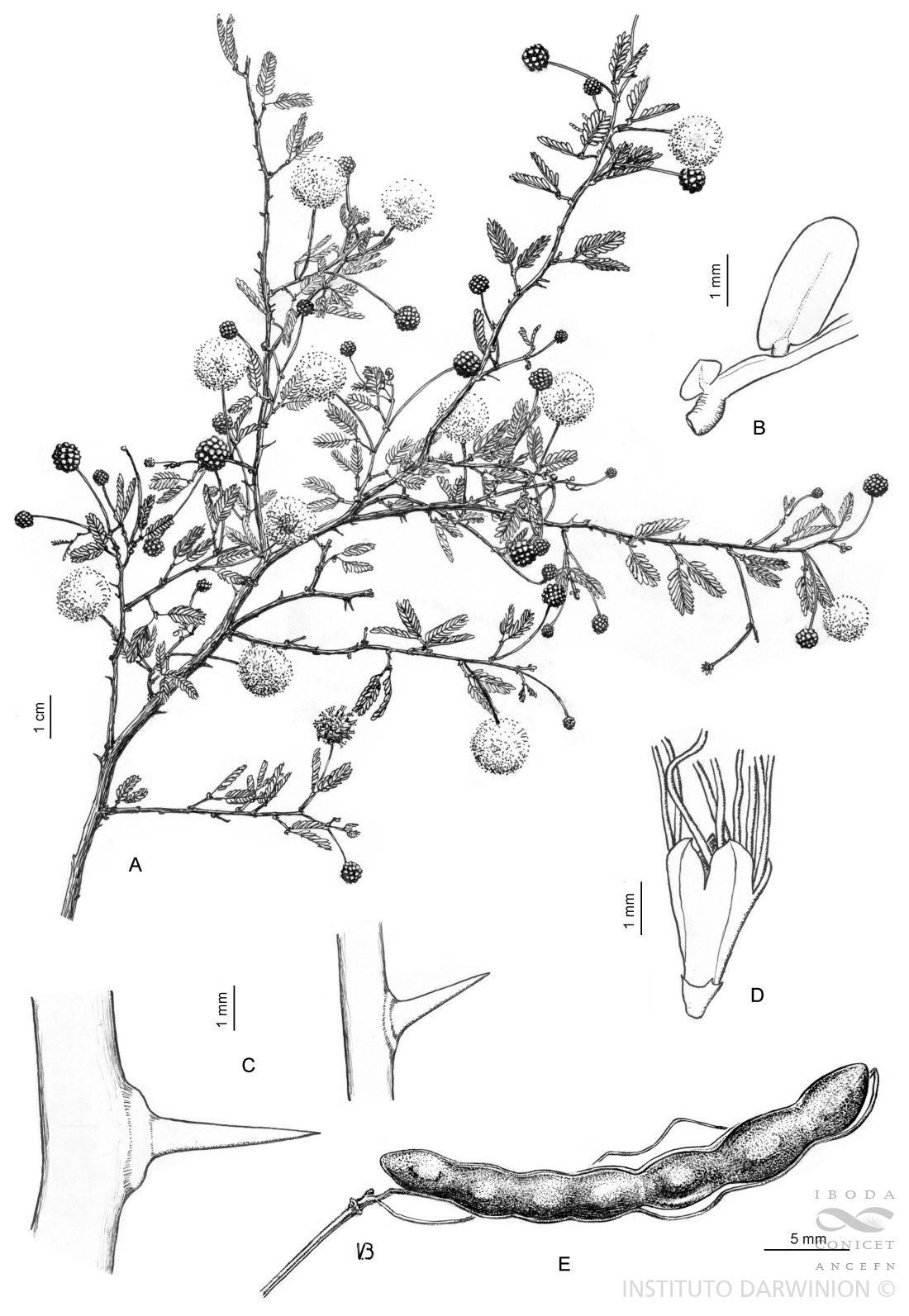 A. Rama florífera. B. Folíolo. C. Espinas. D. Flor. E. Fruto.