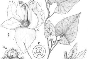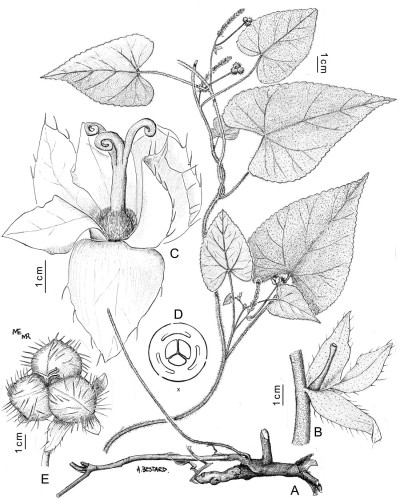 Hierba trepadora; tallos con entrenudos de 6-14 mm de largo, laxamente hirsutos con tricomas hasta de 2,5 mm de largo, rígidos, retrorsos, dorados, de base pluricelular, con escasos tricomas urticantes y cortos tricomas 1-celulares. Hojas con pecíolos de (3-)4-11 cm de largo; estípulas ovadas, de 4-4,5 mm de largo, agudas, con cilias largas en el margen y glabrescentes en el dorso, caducas; lámina anchamente ovada, de (4-)7-15 × (3,5-)5-11 cm, acuminada, cordada, dentada, dientes acuminados, con tricomas esparcidos largos, rígidos, de base pluricelular en la cara superior, y tricomas urticantes sobre las venas y glandulares subsésiles en ambas caras. Inflorescencias en botrioides densos; eje basal lateral con una flor pistilada y eje principal abierto hasta con 50 flores estaminadas; pedúnculo de 4-27 mm de largo; raquis y pedicelos con cortos tricomas rígidos, patentes y glandulares subsésiles; bráctea basal 3-partida, semiamplexicaule, de 4,5-5 × 0,7-2 mm, segmentos lanceolados o elípticos; brácteas del eje principal oblongas o elípticas, de 2,8-3,5 × 0,7-1,5 mm, las basales de 4,5-5 mm de largo, agudas u obtusas, ciliadas, con tricomas glandulares subsésiles en ambas caras. Flores estaminadas con epipodio de 0,5-1 mm de largo, hipopodio de 1-2,5 mm de largo; sépalos 3, subcirculares, de 1,2-1,6 × 0,6-1,5 mm, apiculados, violáceos; estambres 2, filamentos cilíndricos, de 0,5 mm de largo, anteras de contorno oblongo de 0,4 mm de largo; nectario central pulvinado. Flores pistiladas con pedicelo de 2,5 mm de largo, articulado cerca del ápice, sépalos 6, anchamente elípticos de 3-3,5 × 2-2,5 mm, agudos, ciliados, dorso glabrescente; ovario con tricomas urticantes cortos, estilo de 3 mm de largo, 3-fido, ramas estigmáticas libres, sub-lisas sin papilas definidas. Fruto de 10-12 mm de diámetro; pedicelo de 12-22 mm de largo. Semillas subglobosas, de más de 3,5 mm de diámetro, variegadas, tegumento papiloso, papilas subesféricas.