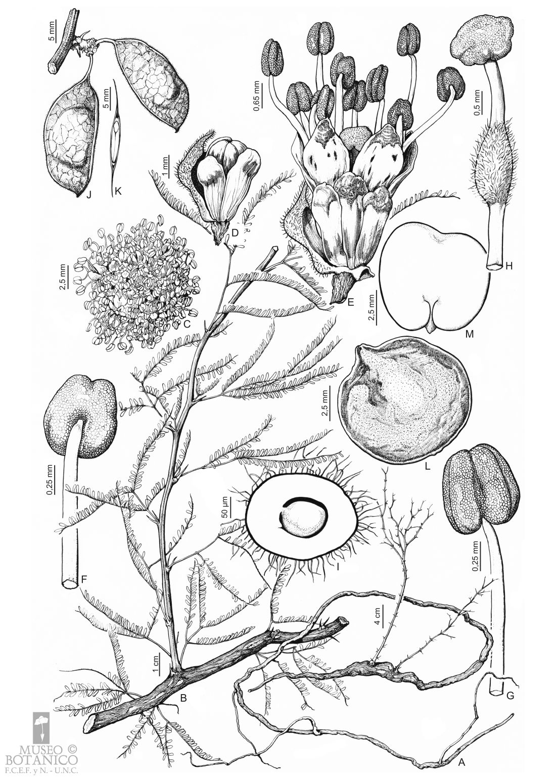 A. Rama. B. Rama. C. Inflorescencia globosa. D. Botón floral y bráctea. E. Flor, vista lateral. F-G. Estambres, vista dorsal y ventral respect. H. Gineceo. I. Transcorte por ovario. J. Frutos. K. Corte longitudinal por fruto. L. Semilla, vista lateral. M. Embrión.