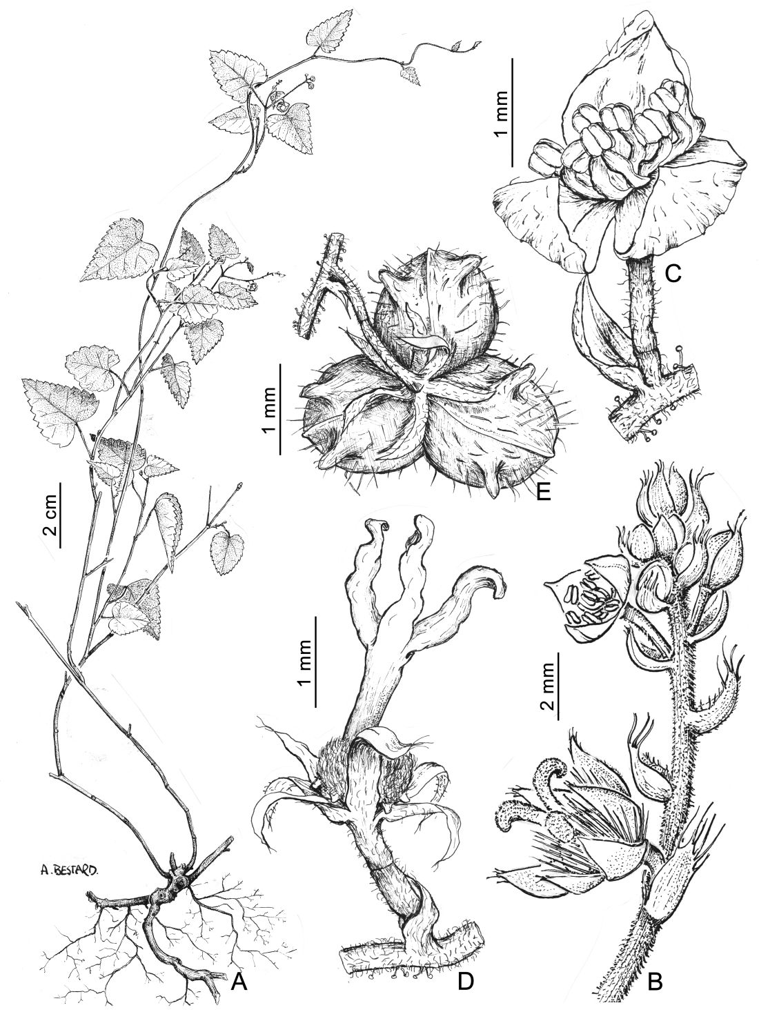 A. Planta. B. Inflorescencia. C. Flor estaminada. D. Flor pistilada. E. Fruto.
