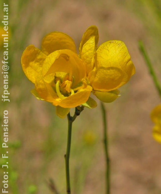 Arbusto generalmente pequeño, de 0,40-1,50 m alt. Ramas de 0,75-4 mm diám. gla¬bras, con aspecto desordenado, con los extremos algo péndulos, generalmente no espino¬sos; ángulo de divergencia de las ramas 10° — 65°. Hojas de 0,5-2 mm, escamosas, trian¬gulares, glabras, persistentes; estípulas ausentes. Racimos simples 1-floros (2-floros). Sé¬palos de 5-12 mm, obovados. Pétalos de ± 8-17 x 4-11 mm, amarillos. Gineceo de 10-14 mm, glabro. Legumbre recta o levemente arqueada. Semillas en posición longitudinal-oblicua.