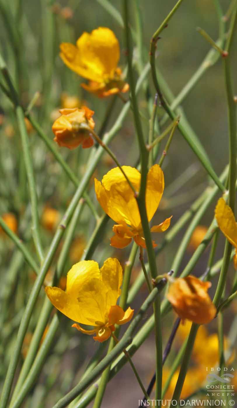 Arbusto generalmente pequeño, de 0,40-1,50 m alt. Ramas de 0,75-4 mm diám. gla¬bras, con aspecto desordenado, con los extremos algo péndulos, generalmente no espino¬sos; ángulo de divergencia de las ramas 10° — 65°. Hojas de 0,5-2 mm, escamosas, trian¬gulares, glabras, persistentes; estípulas ausentes. Racimos simples 1-floros (2-floros). Sé¬palos de 5-12 mm, obovados. Pétalos de ± 8-17 x 4-11 mm, amarillos. Gineceo de 10-14 mm, glabro. Legumbre recta o levemente arqueada. Semillas en posición longitudinal-oblicua.