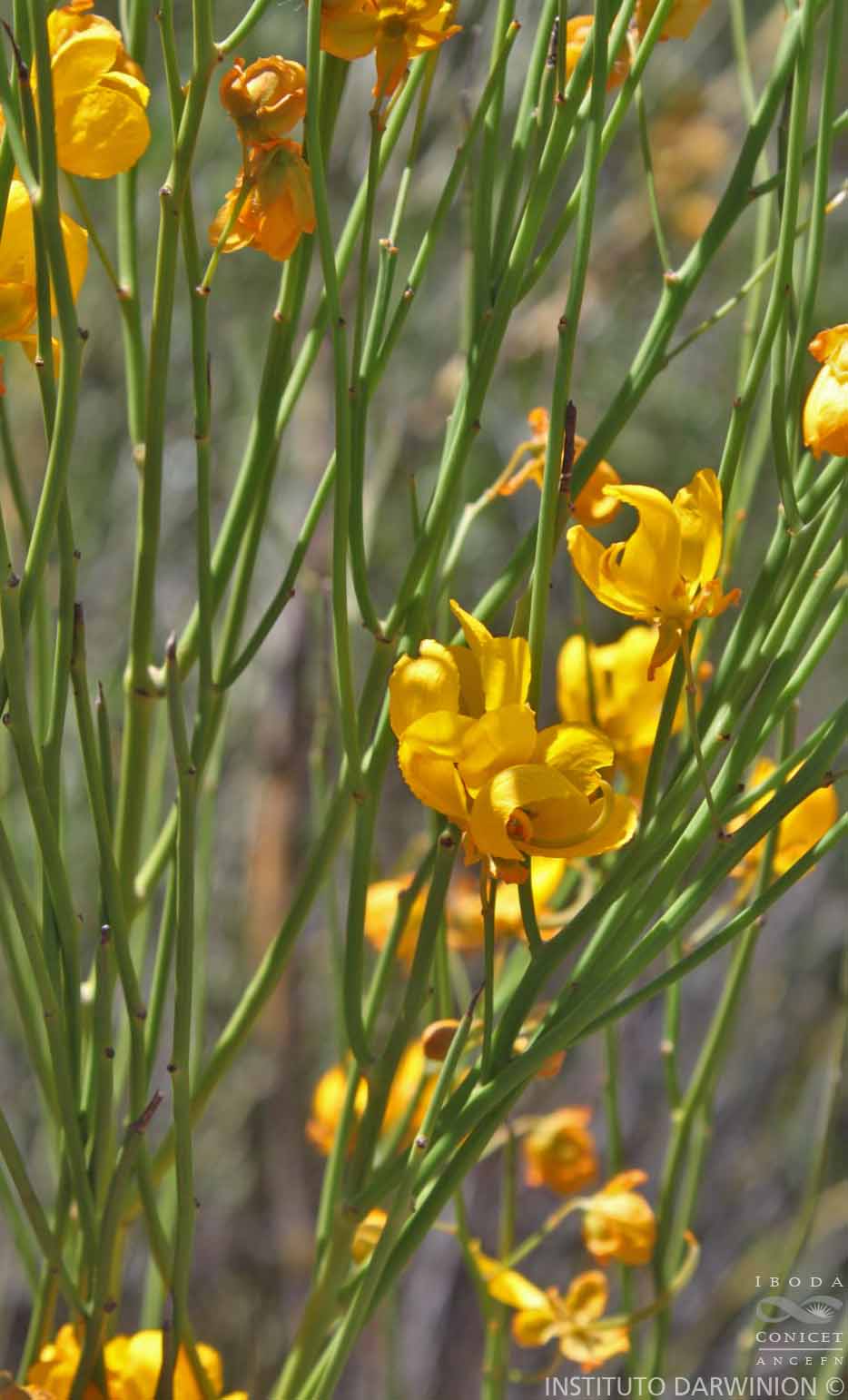 Arbusto generalmente pequeño, de 0,40-1,50 m alt. Ramas de 0,75-4 mm diám. gla¬bras, con aspecto desordenado, con los extremos algo péndulos, generalmente no espino¬sos; ángulo de divergencia de las ramas 10° — 65°. Hojas de 0,5-2 mm, escamosas, trian¬gulares, glabras, persistentes; estípulas ausentes. Racimos simples 1-floros (2-floros). Sé¬palos de 5-12 mm, obovados. Pétalos de ± 8-17 x 4-11 mm, amarillos. Gineceo de 10-14 mm, glabro. Legumbre recta o levemente arqueada. Semillas en posición longitudinal-oblicua.