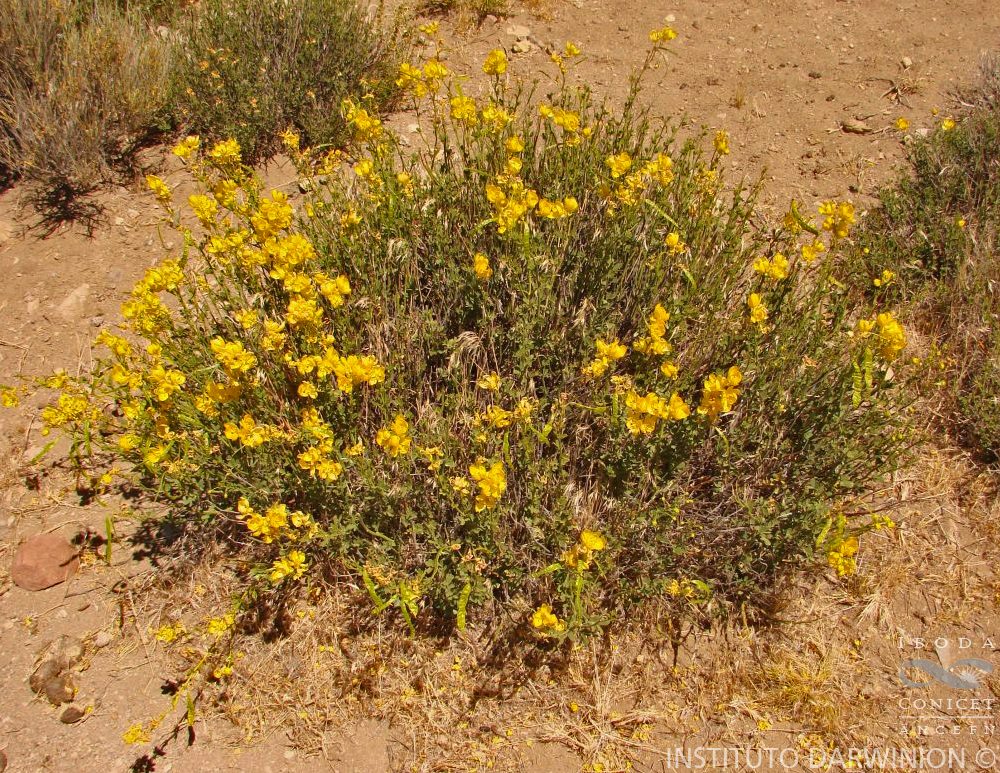 Arbusto muy ramificado, de 30-65 (120) cm alt; ramas de 1-4 mm diám. Hojas de 2-3,5 cm, 2-yugadas, a veces 3-folioladas con supresión del raquis; folíolos obovado-o-blongos, mucronulados o emarginados, cuneados, con líneas rojizas, cara adaxial general¬mente glabra, cara abaxial subglabra o pubérula, puncticulada; glándula de ± 0,5 mm, ci-líndrico-cónica, rojiza; estípulas de 1-2 mm, lanceolado-triangulares, rojas, carnosas, acuminadas, notablemente hinchadas. Racimos 1-2-floros. Cáliz con 2 sépalos menores, de 5-6 x 3-4 mm, obovado-lanceolados, y 3 mayores, de 8-9 x 4-7 mm, obovados. Péta¬los de 15-18 x 8-11 mm, amarillos. Gineceo de aprox. 17 x 1-1,5 mm; ovario seríceo. Le¬gumbre de 7-10 x 0,8-1,1 cm, aplanada, cuando joven ralamente pubescente, luego gla¬bra o subglabra; semillas 15-20, en posición longitudinal-trasversal.