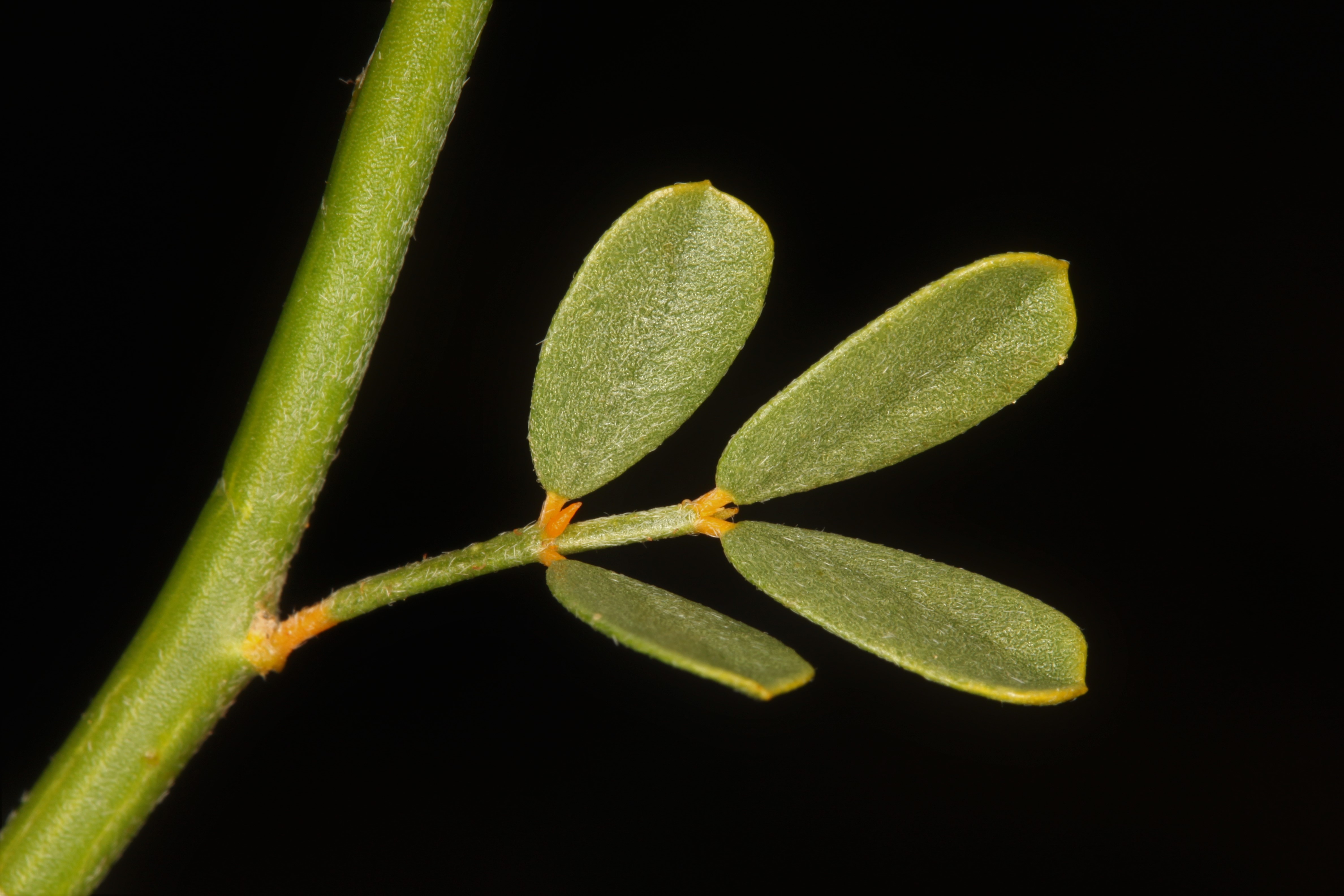 Arbusto muy ramificado, de 30-65 (120) cm alt; ramas de 1-4 mm diám. Hojas de 2-3,5 cm, 2-yugadas, a veces 3-folioladas con supresión del raquis; folíolos obovado-o-blongos, mucronulados o emarginados, cuneados, con líneas rojizas, cara adaxial general¬mente glabra, cara abaxial subglabra o pubérula, puncticulada; glándula de ± 0,5 mm, ci-líndrico-cónica, rojiza; estípulas de 1-2 mm, lanceolado-triangulares, rojas, carnosas, acuminadas, notablemente hinchadas. Racimos 1-2-floros. Cáliz con 2 sépalos menores, de 5-6 x 3-4 mm, obovado-lanceolados, y 3 mayores, de 8-9 x 4-7 mm, obovados. Péta¬los de 15-18 x 8-11 mm, amarillos. Gineceo de aprox. 17 x 1-1,5 mm; ovario seríceo. Le¬gumbre de 7-10 x 0,8-1,1 cm, aplanada, cuando joven ralamente pubescente, luego gla¬bra o subglabra; semillas 15-20, en posición longitudinal-trasversal.