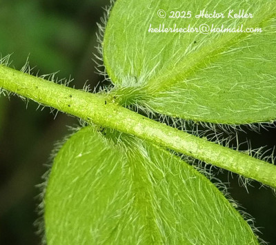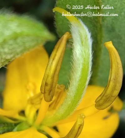 Arbustos 1-2 m alt., erectos; tallos cilíndricos macizos, ramas, hojas e inflorescencias breve y densamente pubescentes. Hojas (2-)3-5 yugadas, 4-10(-14) cm long.; estípulas lineares, subuladas, caducas, raquis con glándula gruesa oval mucronada entre el primer par de folíolos, éstos elípticos u oblongo –lanceolados, 2-4(-6) cm long. x 0,4-1,4 cm lat., en general los apicales mayores, margen revoluto, hipofilo densamente pubescente. Inflorescencias frondosas, vistosas, botones florales globosos ; cáliz ?. corola ? de pétalos obovales, 1cm long., estambres trimorfos, los 3 adaxiales estériles, 4 medianos breves y 2-3 abaxiales largos, curvados, de ápice truncado; ovario piloso, estilo glabro o proximalmente puberulento, (52-)56-86-ovulado. Legumbre subcilíndrica a tetragonal, pubescente, indehiscente, erguida o patente, 5-6 cm long. x 0,6-0,7 cm diám, algo pulposa, de caras levemente irregulares. Semillas numerosas, transversales, entre falsos septos, biseriadas, en dos hileras longitudinales, oliváceas y comprimidas, (2,9-)3,3-4,6 mm long x (2-)2,7-3 mm lat.
