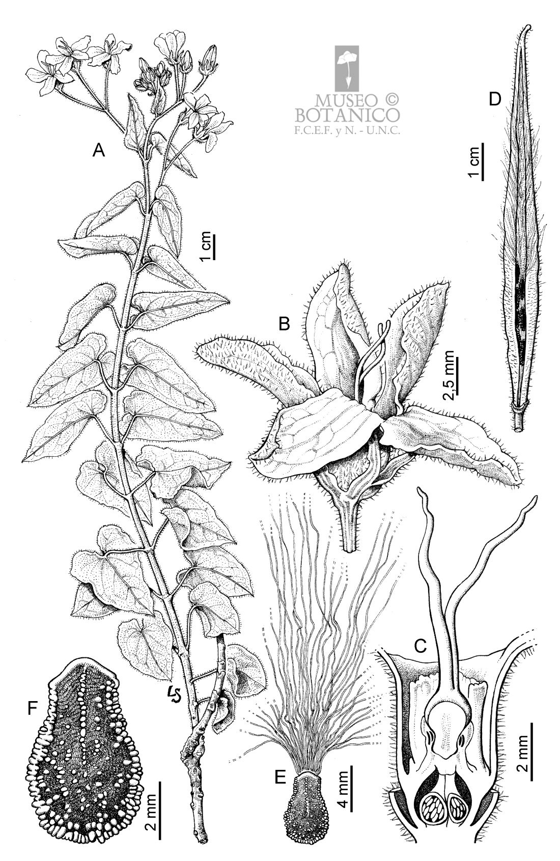 A. Planta. B. Flor, vista lateral. C. Corte longitudinal por flor, corola seccionada. D. Fruto dehiscente. E. Semilla con coma. F. Semilla sin coma.