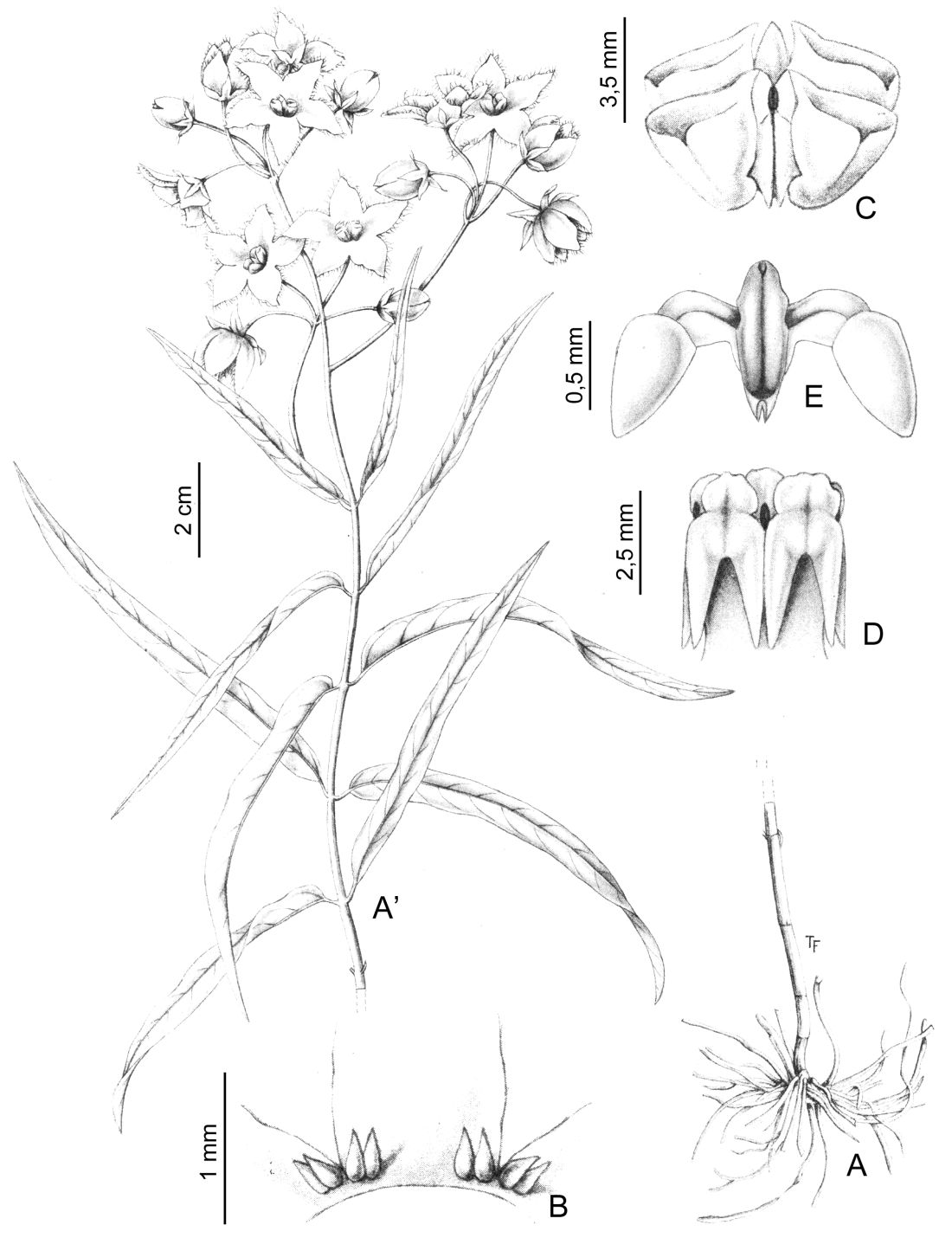 A-A’. Planta con flores. B. Coléteres en el cáliz. C. Corona. D. Ginostegio. E. Polinario. Tomado de Gen. Sp. Pl. Argent. 2: lámina 102. 1944.