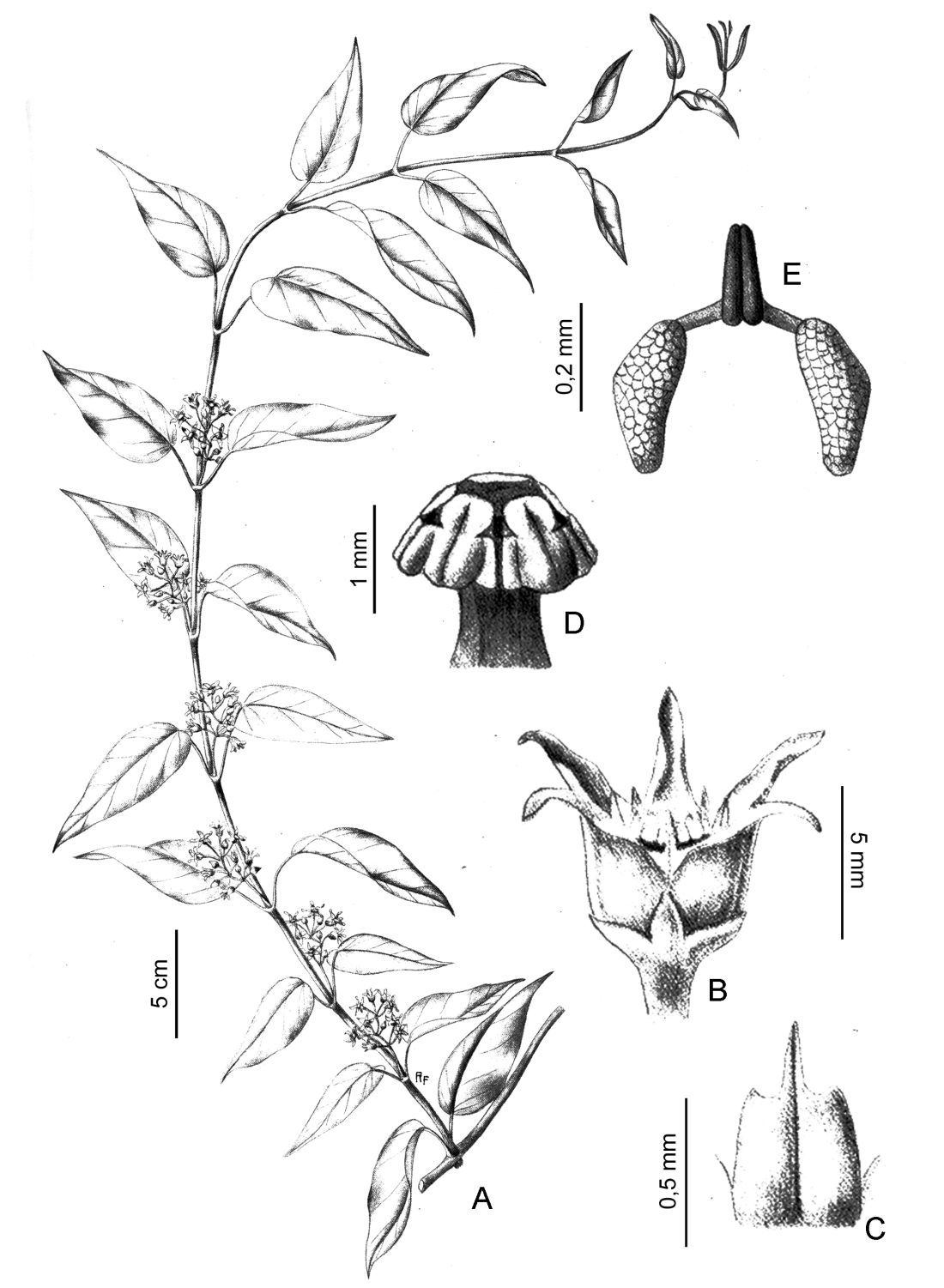 A. Rama florífera. B. Flor. C. Lóbulo de la corona. D. Ginostegio. E. Polinario. Tomado de Gen. Sp. Pl. Argent. 2: lámina 65. 1944.