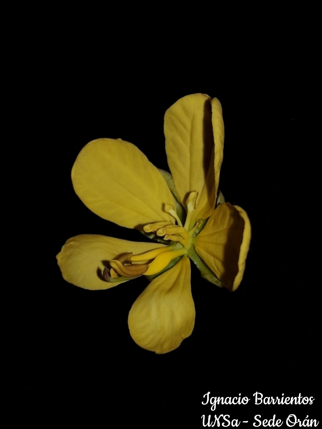 Planta anual, robusta, 0, 30-1,5 m alt., glabra. Hojas 4-6 yugadas, paripinadas, con glándula peciolar ovoide, folíolos ovado-lanceolados, 2-7,5 cm long. x 1-3,5 cm lat. Racimos compuestos, frondosos solamente en los nudos basales ; flores con cáliz... ? corola.... ?completar datos en, pétalos anaranjados, 1,2-1,5 cm long, estambres largos curvados en la dirección del gineceo, con ápice prolongado y lingüiforme. Legumbre normalmente erguida, lineal, arqueada, multiseminada, dehiscente sin elasticidad, gruesa, algo comprimida, seca, 8,5 -14 cm long. x 7-10 mm lat., interiormente con falsos y delgados tabiques transversales. Semillas ovo-piriformes, de rafe central, comprimidas, de 3-5 mm long., gris oliváceas.