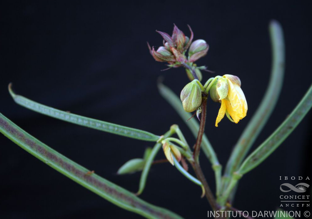 Planta anual, robusta, 0, 30-1,5 m alt., glabra. Hojas 4-6 yugadas, paripinadas, con glándula peciolar ovoide, folíolos ovado-lanceolados, 2-7,5 cm long. x 1-3,5 cm lat. Racimos compuestos, frondosos solamente en los nudos basales ; flores con cáliz... ? corola.... ?completar datos en, pétalos anaranjados, 1,2-1,5 cm long, estambres largos curvados en la dirección del gineceo, con ápice prolongado y lingüiforme. Legumbre normalmente erguida, lineal, arqueada, multiseminada, dehiscente sin elasticidad, gruesa, algo comprimida, seca, 8,5 -14 cm long. x 7-10 mm lat., interiormente con falsos y delgados tabiques transversales. Semillas ovo-piriformes, de rafe central, comprimidas, de 3-5 mm long., gris oliváceas.
