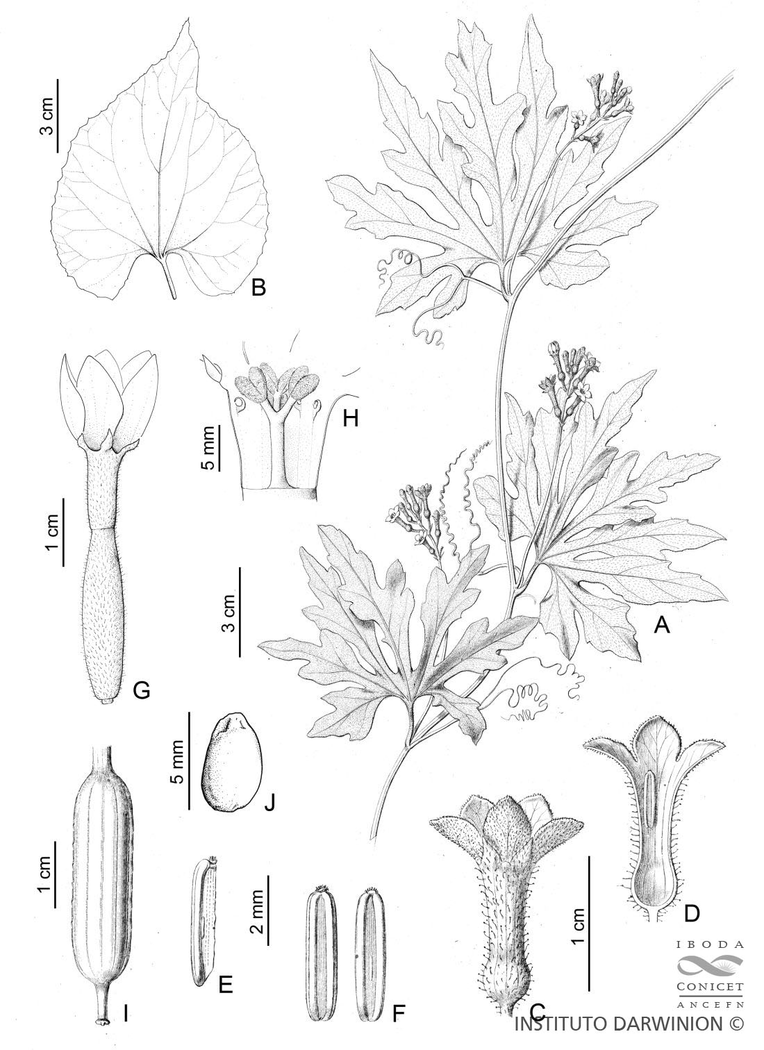 Hemicriptófitos zarcillosos diclinomonoicos. Pecíolos de 7-25 mm; láminas profundamente 5-7(-9)-lobadas (excepcionalmente enteras, cordiformes), de 8-20,8 x 8,5-20,2 cm, discolores, lóbulos lanceolados o linear lanceolados, irregularmente dentados. Zarcillos 2-fidos (raramente 3-fidos). Monocasios estaminados racemiformes 5-23-floros, hasta de 20 cm de longitud; pedicelos de 3-18 mm. Flores estaminadas usualmente con bráctea linear de 2-8 mm; hipanto subcilíndrico-infundibuliforme, de 7-12 mm x 2-4 mm, interior glabro; sépalos triangular-lanceolados, de 1,2-2 mm x 1 mm; pétalos ovados o anchamente elípticos, de (5-)7-8 x (3-)4-5,5 mm, amarillos, con abundantes tricomas glandulares moruliformes en el haz; anteras de 4-4,5 mm; conectivo con pelos ampuliformes. Flores carpeladas solitarias, a veces coaxilares con la inflorescencia estaminada; pedicelo ca. 3 cm; hipanto cilíndrico, de 9-13 x 4-6 mm, interior glabro; sépalos lanceolados de 3,5-4 mm de largo; corola similar a la de las flores estaminadas pero los pétalos mayores, de 7-20 x 5-11 mm; estaminodios 5, subulados e incurvos, ca. 2 mm de largo; ovario de 1,8-4 cm x 4-7 mm, 3-carpelar; estilo ca. 1 cm, con 3 ramas breves; estigmas 2-fidos, segmentos oblongoides, papilosos. Baya oblongoide, de 3,5-7,2 x 0,7-1,3 cm, lisa, con un apículo ca. 1 cm. Semillas obovado-elipsoides, apenas comprimidas, de 5 x 3 mm y ca. 2 mm de grosor, lisas, de color castaño-pajizo, margen sagital apenas marcado.