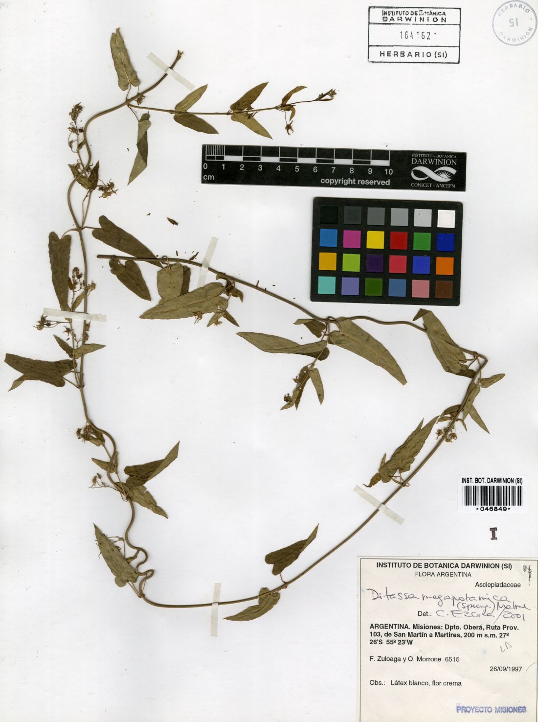 Voluble de 2-4 m de altura, ramas pubescentes a glabrescentes. Hojas con pecíolo de 0,7-2,5 cm de largo, pubescente a glabrescente; lámina ovado-triangular a lanceolada, de 2,2-6,4 × 0,6-2 cm, ápice acuminado, base cordada, glabras, cara adaxial con 4 coléteres en el seno. Inflorescencias corimbiformes, extraaxilares, alternas, con 3-7 flores, pedúnculo de 6-22 mm de largo, pubescente a glabrescente. Flores con pedicelo 8-12 mm de largo, pubescente; cáliz con lóbulos linear-lanceolados, de 1,5-1,6 × 0,4-0,5 mm, acuminados, externamente pubescentes, cara interna glabra con un coléter en el seno, a veces ausente; corola con tubo campanulado, de 0,9-1 mm de largo, amarillo-verdosa, lóbulos ovado-lanceolados, de 8 × 2,5 mm, patentes a reflexos, retorcidos en el tercio distal, revolutos, cara externa pubérula, cara interna glabrescente; corona con lóbulos de 1,5 × 1,6 mm, con dos segmentos laterales de 0,1-0,2 mm de largo, amarillenta; ginostegio sésil, de 0,8-1 mm de largo, cabeza estilar mútica, blanco-violácea; anteras cuadrangulares, de 0,5-0,6 mm de largo, con membrana apical suborbicular de 0,2 mm de diámetro; polinario con el retináculo ovado, de 0,16-0,21 × 0,06-0,09 mm, ápice agudo, caudículas de 0,15-0,18 mm de largo, descendentes, edentadas, polinios de contorno oblongo, de 0,24-0,27 × 0,06-0,09 mm. Folículos fusiformes, de 6-7 cm de largo, generalmente simples. Semillas no vistas.