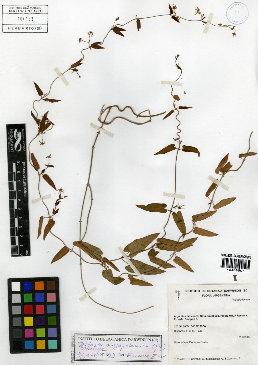Voluble de 2-4 m de altura, ramas pubescentes a glabrescentes. Hojas con pecíolo de 0,7-2,5 cm de largo, pubescente a glabrescente; lámina ovado-triangular a lanceolada, de 2,2-6,4 × 0,6-2 cm, ápice acuminado, base cordada, glabras, cara adaxial con 4 coléteres en el seno. Inflorescencias corimbiformes, extraaxilares, alternas, con 3-7 flores, pedúnculo de 6-22 mm de largo, pubescente a glabrescente. Flores con pedicelo 8-12 mm de largo, pubescente; cáliz con lóbulos linear-lanceolados, de 1,5-1,6 × 0,4-0,5 mm, acuminados, externamente pubescentes, cara interna glabra con un coléter en el seno, a veces ausente; corola con tubo campanulado, de 0,9-1 mm de largo, amarillo-verdosa, lóbulos ovado-lanceolados, de 8 × 2,5 mm, patentes a reflexos, retorcidos en el tercio distal, revolutos, cara externa pubérula, cara interna glabrescente; corona con lóbulos de 1,5 × 1,6 mm, con dos segmentos laterales de 0,1-0,2 mm de largo, amarillenta; ginostegio sésil, de 0,8-1 mm de largo, cabeza estilar mútica, blanco-violácea; anteras cuadrangulares, de 0,5-0,6 mm de largo, con membrana apical suborbicular de 0,2 mm de diámetro; polinario con el retináculo ovado, de 0,16-0,21 × 0,06-0,09 mm, ápice agudo, caudículas de 0,15-0,18 mm de largo, descendentes, edentadas, polinios de contorno oblongo, de 0,24-0,27 × 0,06-0,09 mm. Folículos fusiformes, de 6-7 cm de largo, generalmente simples. Semillas no vistas.