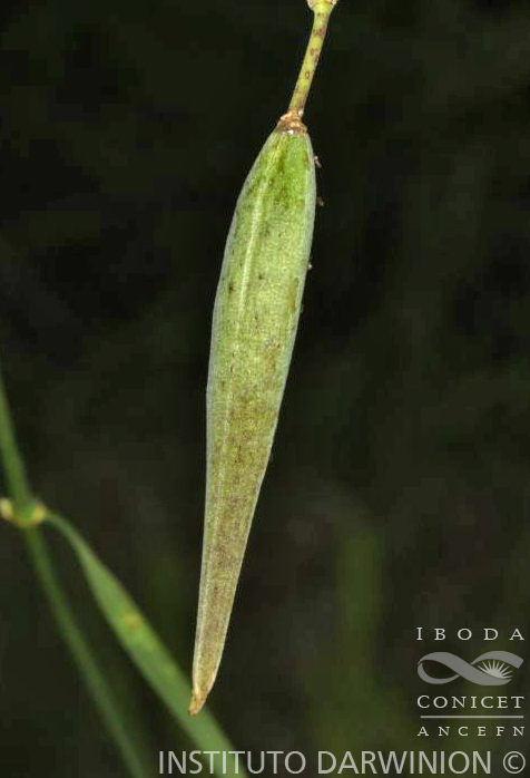 Voluble, de 4-6 m de alto, tallos suberosos en la base, glabros hacia el ápice. Hojas glabras; pecíolo de 2 mm de largo, lámina linear-lanceolada, de 3-5 × 0,2-0,3 cm, base aguda, ápice agudo a acuminado. Inflorescencias umbeliformes, plurifloras, pedúnculo de 3-7 cm de largo, glabro. Flores con pedicelo de 0,8-1 cm de largo, piloso; cáliz con lóbulos ovado-lanceolados, de 2 × 0,8-0,9 mm, glabros en la cara adaxial, pilosos en la abaxial; corola blanca a amarillo-verdosa, tubo brevísimo, lóbulos ovado-lanceolados, de 3 × 2 mm; corona blanca, glabra, más alta que el ginostegio, lóbulos internos gruesos, de aspecto vesiculoso, de 2 × 1,5 mm; ginostegio sésil de 1 mm de alto, 5-gonal; retináculo romboidal, de 0,2 × 0,18 mm; caudículas horizontales de 0,09 mm de largo; polinios subcilíndricos, de 0,6 × 0,18 mm, algo arqueados. Folículos de 6-6,2 cm de largo, superficie lisa, pubérula. Semillas no vistas.