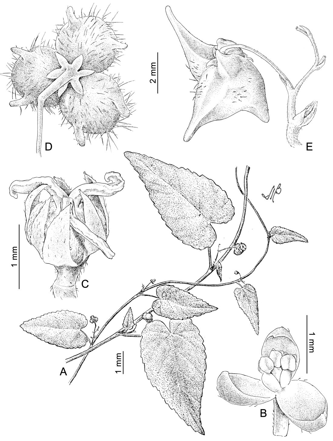Sufrútice voluble hasta de 3 m de largo; tallos con entrenudos de 2,5-9,5 cm de largo, ramas laterales floríferas con entrenudos de 0,2-2 cm de largo, pubescencia de tricomas 1-celulares largos y cortos retrorsos, además escasos tricomas urticantes más abundantes en la zona apical. Hojas con pecíolos de 1-5 cm de largo; estípulas angostamente triangular ovadas, de 0,1-0,4 cm de largo, agudas o acuminadas, ciliadas y con tricomas adpresos en el dorso; lámina generalmente triangular ovada, a veces angostamente ovada u oblonga, de 2-9 × 1-5,5 cm, aguda o acuminada, obtusa, truncada, redondeada o generalmente cordada, aserrada o subentera, membranácea, generalmente subglabra, las juveniles urticantes pubescentes, con tricomas 1-celulares cortos, retrorsos, y largos de base pluricelular y excepcionalmente glandulares capitados, subsésiles. Inflorescencias en botrioides terminales, laxos, a veces sobre braquiblastos, entonces aparentemente axilares; pedúnculo de 0,2-1 cm de largo; eje basal lateral con una flor pistilada y eje terminal abierto, hasta de 5 cm de largo, con más de 50 flores estaminadas y/o eje terminal cerrado, hasta de 1,5 cm de largo, con hasta 4 o 5 flores estaminadas; bráctea basal 2-3 partida a 2-3 secta, excepcionalmente entera, de 1-2 mm de largo; brácteas del eje terminal angostamente ovadas o lineares, de 0,5-2,5 × 0,2-0,5 mm, acuminadas, y semiamplexicaules, ciliadas y con dorso pubescente. Flores estaminadas con epipodio de 0,6-1,2 mm de largo e hipopodio de 0,6 1,5 mm de largo, pubescente; sépalos generalmente 3, obovados o elípticos, de 0,9-1,5 × 0,3-0,6 mm, con escasos tricomas 1-celulares adpresos en el dorso; estambres 2-3(-4-5); filamentos erguidos, claviformes, apiculados, de 0,4-0,5 mm de largo; anteras ovoides, de 0,2-0,4 mm de largo, a veces el conectivo supera levemente las tecas. Flores pistiladas con epipodio de 0,2-2 mm de largo e hipopodio acrescente de 1,5-4 mm de largo; sépalos 6, angostamente ovados a lanceolados, de 1-2,5 × 0,4-0,7 mm, imbricados, agudos o acuminados, con tricomas 1-celulares adpresos y urticantes en el margen y en el dorso; ovario urticante pubescente, cada carpelo levemente apiculado en el dorso y a veces en la base lateralmente 2-corniculado; estilos de 0,4-0,7 mm de largo, unidos sólo en la base o hasta la parte media, ramas libres patentes en el fruto; superficie estigmática sublisa. Fruto esférico, de 4-6 mm de diámetro, 6-corniculado, urticante; pedicelo hasta de 30 mm de largo. Semillas subglobosas, de 2,7-3 mm de diámetro, superficie seminal con papilas esféricas a cilíndricas o cónicas.