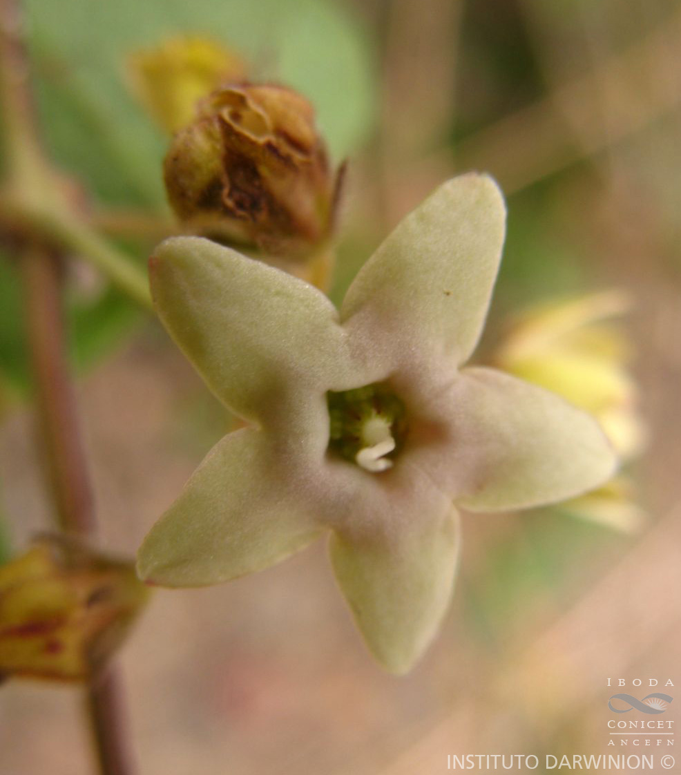 Subarbusto ramoso, con ramas pubescentes, frecuentemente con el ápice voluble. Hojas con pecíolo de 0,5-1 cm de largo, pubérulo; lámina ovado-triangular, de 1-2 × 0,8-1,5 cm, de base cordada, ápice agudo, ambas caras densamente pubérulas. Inflorescencias umbeliformes, paucifloras, con pedúnculo hasta de 2 cm de largo, pubescente. Flores con pedicelo hasta de 8 mm de largo, pubescente; cáliz con lóbulos lanceolados, de 1 × 0,3-0,4 mm, pubérulos; corola rotácea, crema, a veces con el centro amarillo-liláceo, con tubo obcónico de 1 mm de largo, lóbulos triangulares, de 2-3 × 1,5-1,8 mm, cara abaxial pubescente, cara adaxial pubérula; corona reducida a 5 vesículas pequeñas, libres entre sí, mucho más cortas que las anteras; ginostegio de 2 mm de largo, anteras subrectangulares con membrana orbicular; cabeza estilar con el apéndice filiforme ca. 3 mm de largo, 2-fido en el ápice; polinario con el retináculo de contorno oblongo, de 0,24 × 0,8 mm, caudículas horizontales de 0,11-0,12 mm de largo, polinios de contorno oblongo, de 0,25-0,26 × 0,05. Folículos fusiformes, de 3-4 cm de largo, generalmente simples, glabros, a veces rugosos. Semillas numerosas, con un penacho de pelos ca. 2 cm de largo.