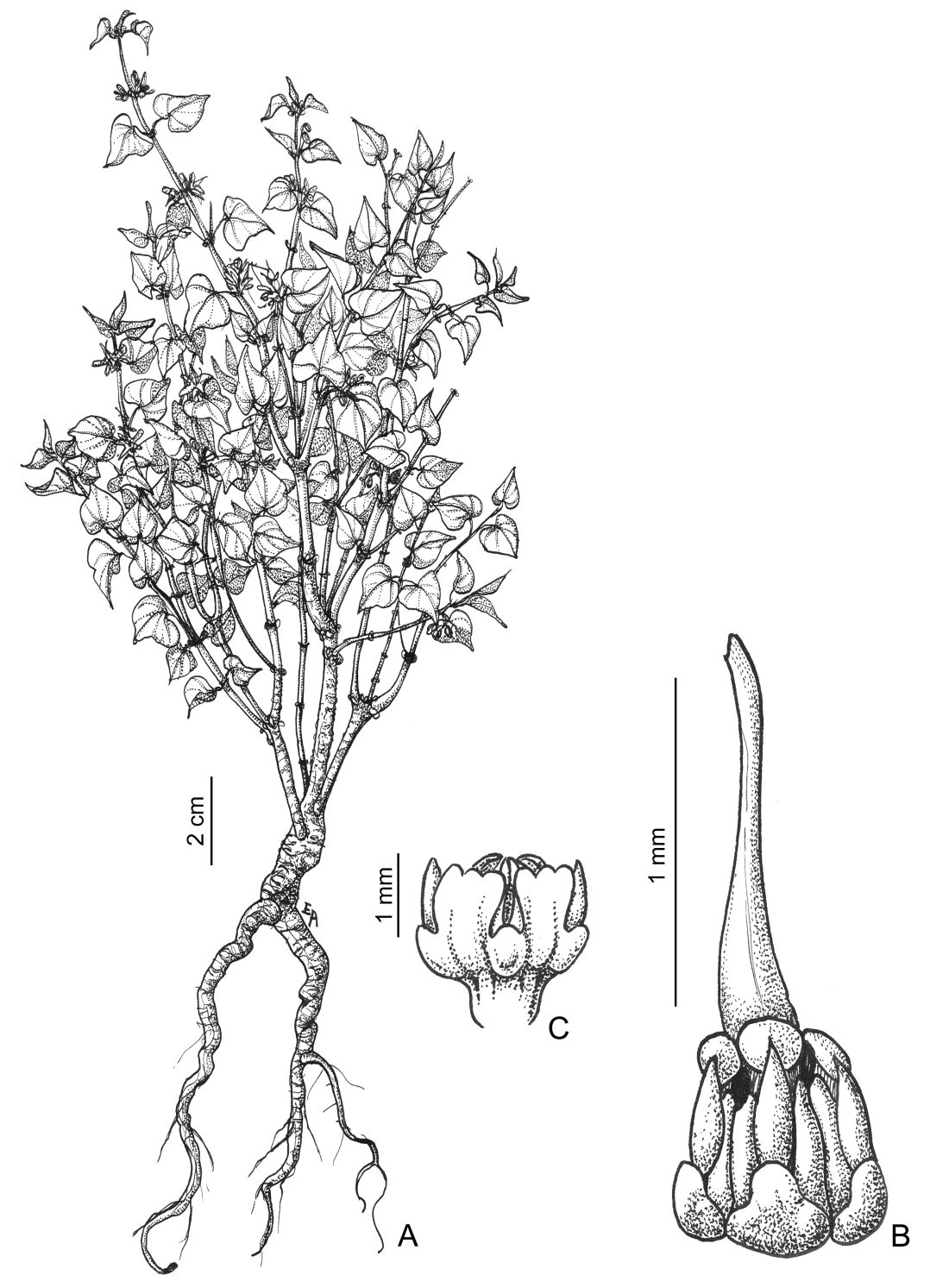 Subarbusto ramoso, con ramas pubescentes, frecuentemente con el ápice voluble. Hojas con pecíolo de 0,5-1 cm de largo, pubérulo; lámina ovado-triangular, de 1-2 × 0,8-1,5 cm, de base cordada, ápice agudo, ambas caras densamente pubérulas. Inflorescencias umbeliformes, paucifloras, con pedúnculo hasta de 2 cm de largo, pubescente. Flores con pedicelo hasta de 8 mm de largo, pubescente; cáliz con lóbulos lanceolados, de 1 × 0,3-0,4 mm, pubérulos; corola rotácea, crema, a veces con el centro amarillo-liláceo, con tubo obcónico de 1 mm de largo, lóbulos triangulares, de 2-3 × 1,5-1,8 mm, cara abaxial pubescente, cara adaxial pubérula; corona reducida a 5 vesículas pequeñas, libres entre sí, mucho más cortas que las anteras; ginostegio de 2 mm de largo, anteras subrectangulares con membrana orbicular; cabeza estilar con el apéndice filiforme ca. 3 mm de largo, 2-fido en el ápice; polinario con el retináculo de contorno oblongo, de 0,24 × 0,8 mm, caudículas horizontales de 0,11-0,12 mm de largo, polinios de contorno oblongo, de 0,25-0,26 × 0,05. Folículos fusiformes, de 3-4 cm de largo, generalmente simples, glabros, a veces rugosos. Semillas numerosas, con un penacho de pelos ca. 2 cm de largo.