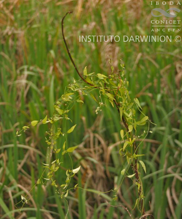 Plantas volubles, de 1-4 m de alto, base leñosa, corteza suberosa agrietada, rámulos cortos y largos diferenciados; con tricomas reflexos dispuestos en líneas longitudinales. Hojas con pecíolo de 2-4 mm de largo, con 0-2 coléteres en la base de la cara adaxial; lámina ovada, de 5-30 × 2,5-12 mm, base cordada a subcordada en la base del tallo, redondeada más arriba, ápice agudo a acuminado, cara adaxial pubérula, cara abaxial glabra. Inflorescencias extraaxilares, 1(-2) por nudo, sésiles, con 2-7 flores. Flores con pedicelo de 1,8-2,2 cm de largo, glabro a piloso; cáliz rotáceo o campanulado, con pocos tricomas en la base abaxial, con coléteres bajo el seno adaxial, lóbulos fusionados en la base, ovados, de 0,9-1,2 × 0,5-0,6 mm, ápice agudo; corola rotácea a campanulada, de 1,4-1,6 × 2-2,5 mm, blanquecina, amarillenta o verdosa, adaxialmente algo papilosa, lóbulos ovados a triangulares, de 0,5 mm de ancho, fusionados en el cuarto basal, ápice agudo, patentes, recurvos a horizontales; corona estaminal de 1-1,3 mm de alto, lóbulos lanceolados apenas fusionados en la base, agudos, erectos; ginostegio cilíndrico, de 0,8-1,1 × 0,6-0,7 mm, sésil; anteras de 0,5-0,6 mm de largo, apéndices conectivales obcordados, de 0,3 × 0,3 mm, fuertemente inflexos; retináculo elipsoide, de 0,12-0,13 × 0,03-0,05 mm; caudículas con forma de “S”, de 0,06 mm de largo; polinios ovoides a reniformes, de 0,11-0,13 × 0,03-0,04 mm. Folículos geminados o simples, angostamente fusiformes, de 25-35 × 1,5-2 mm, glabros, ángulo entre mericarpos cerca de 35°. Semillas 4-6 por folículo, comosas, ovadas, de 6-6,5 × 2,5 mm.