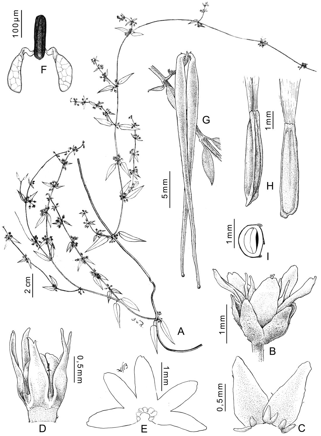 A. Rama florífera. B. Flor. C. Lóbulos del cáliz y coléteres. D. Corona. E. Lóbulos de la corola. F. Polinario. G. Frutos. H. Semilla. I. Semilla en corte transversal.