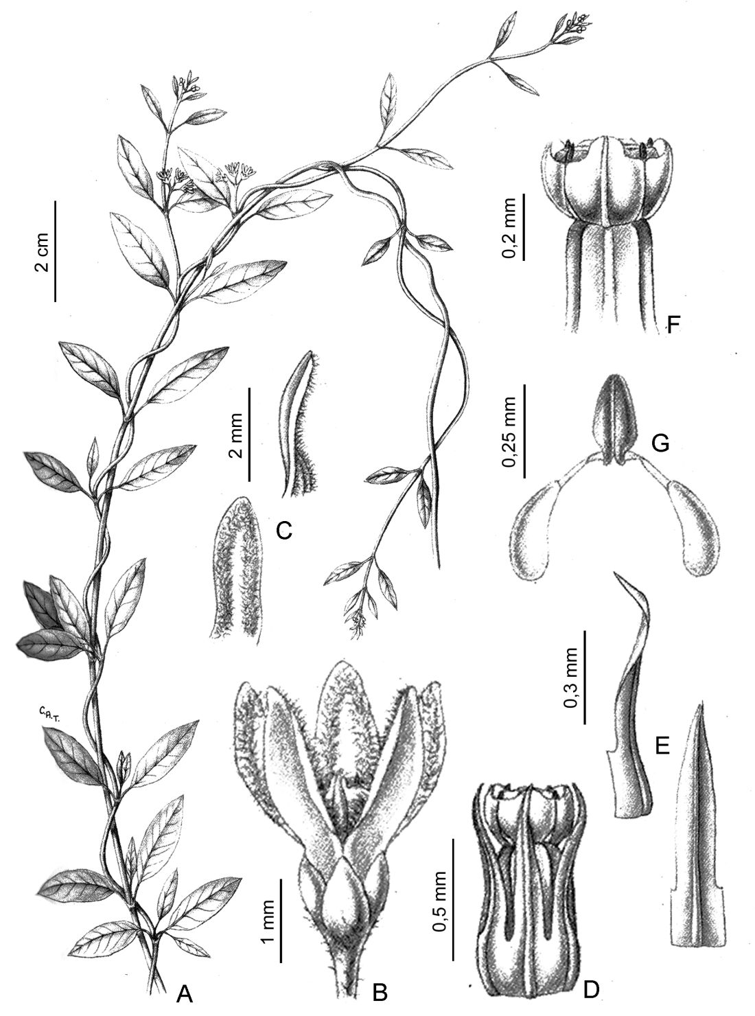 A. Ramas floríferas. B. Flor. C. Lóbulo de la corola. D. Corona y ginostegio. E. Lóbulo de la corona. F. Ginostegio. G. Polinario. Tomado de Gen. Sp. Pl. Argent. 2: lámina 61A. 1944 (sub Metastelma parviflorum).