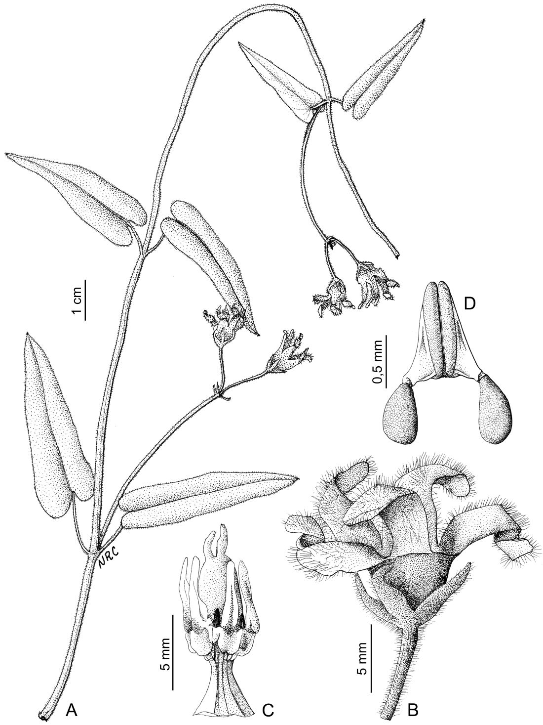 Subarbustos ramificados y volubles en el ápice, con las ramas tomentosas. Hojas con pecíolo de 1,7-2 cm de largo; lámina ovado-triangular, de 6-7 × 3-4 cm, de base cordada, ápice largamente acuminado, cara adaxial con tricomas cortos, esparcidos, cara abaxial albo-tomentosa, discoloras. Inflorescencias umbeliformes, paucifloras, con pedúnculo de 4-7 cm de largo, tomentoso. Flores con pedicelo de 9-15 mm de largo, tomentoso; cáliz con los lóbulos linear-lanceolados, de 6-10 × 1 mm, cara abaxial pubescente, cara adaxial tomentosa, con coléteres debajo del seno; corola con el tubo campanulado, de 5 mm de largo, externamente pubescente, internamente barbado, con los lóbulos lanceolados, de 7-10 × 3-4 mm, algo retorcidos, pubescentes, barbados en la cara adaxial, purpúreos; corona ginostegial ausente; ginostegio sobre un estípite de 2 mm de alto; anteras con las alas de 0,5 mm de largo, membrana apical de 2 mm de largo, ocultando la cabeza estilar; cabeza estilar blanca, de 2-3 mm de largo, base bulbosa estrechándose hacia el ápice en dos apéndices vestigiales; polinario con el retináculo de contorno oblongo, de 0,7 × 3,2 mm, caudículas planas ca. 0,5 mm de largo, muy anchas en la inserción del retináculo, abarcando casi toda la longitud del mismo, polinios ovoides, de 0,6 × 0,4 mm. Folículos ovoides-alargados, de 6-11 × 1,5-4 cm, generalmente simples, con extremos truncados, superficie tomentosa, aterciopelada. Semillas obovadas, de 4,2 mm de largo, comosas.