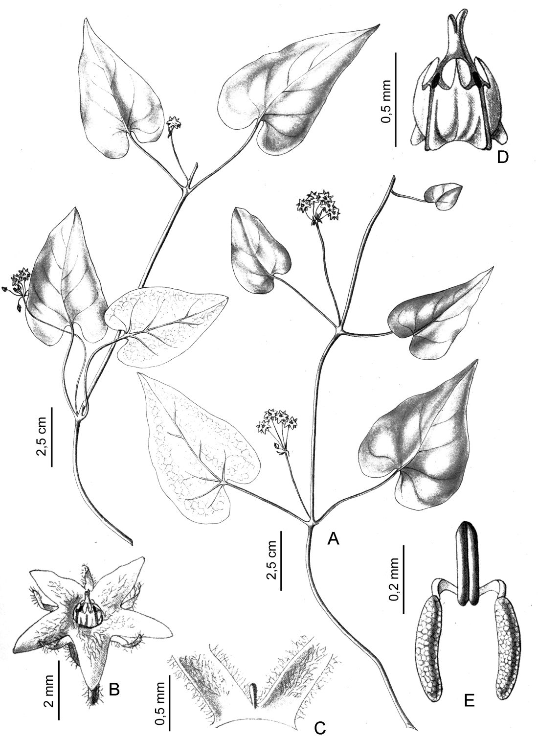 Voluble, herbácea, con ramas gráciles de 2-3 m de largo. Hojas con pecíolo de 4-5 cm de largo; lámina ovado-triangular, de 5-8 × 2-4,8 cm, con la base cordada a subsagitada, ápice largamente acuminado, cara abaxial tomentosa, cara adaxial puberulenta a glabrescente, con coléteres en la base de la vena media, discoloras. Inflorescencias umbeliformes o racemiformes, pauci a multifloras, con pedúnculo de 5-8 cm de largo, pubescente. Flores con pedicelo de 5-6 mm de largo, pubescente; cáliz con lóbulos linear-lanceolados, de 1,5 × 0,3-0,5 mm, cubierto de tricomas blancos en ambas caras, con un coléter debajo de cada seno en la cara interna; corola rotácea, blanco-verdosa, con lóbulos lanceolados, de 2 × 0,6 mm, cara abaxial con abundantes tricomas largos, cara adaxial con tricomas cortos, esparcidos; ginostegio estipitado, cabeza estilar convexa con un apéndice breve, 2-furcado, raro mútica; anteras con membrana apical suborbicular; polinario con el retináculo de contorno oblongo, de 0,24 × 0,06 mm, caudículas horizontales de 0,06 × 0,03 mm, polinios de contorno oblongo, de 0,28-0,30 × 0,07 mm, pendientes. Folículos y semillas no vistos.