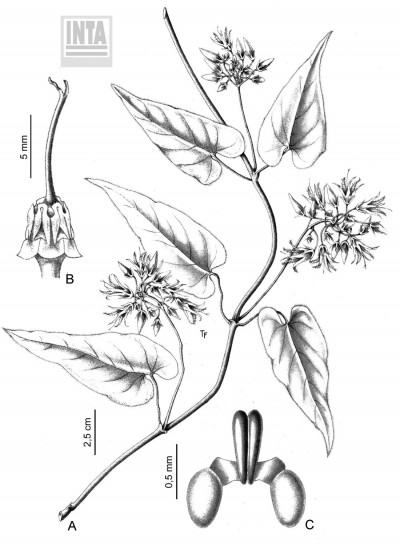 Voluble, de varios metros de alto, con tallos cubiertos de pequeños tricomas blanquecinos. Hojas con pecíolo de 2-6 cm de largo, pubescente; lámina ovado-triangular, de 7-15 × 3-7 cm, la base profundamente cordada, ápice largamente acuminado, cara abaxial tomentosa, tricomas cortos esparcidos en ambas caras, más abundantes en la cara abaxial. Inflorescencias subumbeliformes, multifloras, con el pedúnculo de 4-9 cm de largo, pubescente. Flores con pedicelo de 1-2 cm, pubescente; cáliz con coléteres debajo del seno, lóbulos linear-lanceolados, de 5-7 × 0,8-1,5 mm, vilosos; corola blanca a blanco-verdosa, el tubo campanulado, de 4 mm de largo, superficie externa pubescente, superficie interna barbada hacia la garganta, lóbulos angostamente lanceolados, de 10 × 2-2,5 mm, algo retorcidos, cara abaxial pubescente, cara adaxial lanoso-barbada; ginostegio de 2,5-3 mm de alto, con apéndice de la cabeza estilar filiforme de 8-9 mm de largo, entero o brevemente 2-furcado en el ápice; anteras de 2 mm de largo, con membrana apical cuadrangular de 1 mm de largo; polinario con el retináculo obovoide, de 0,45-0,54 × 0,20-0,25 mm, caudículas subhorizontales de 0,10-0,18 × 0,15-0,25 mm, planas, polinios ovoides, de 0,4-0,6 × 0,25-0,30 mm. Folículos y semillas no vistos.