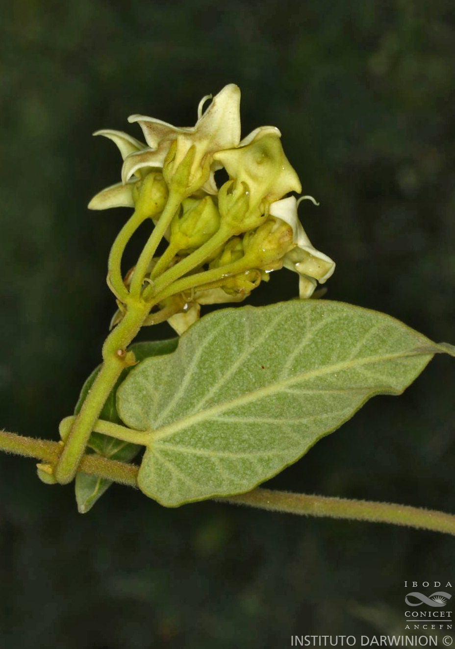 Voluble, de 4-5 m de alto, con ramas albido-tomentosas, cubiertas de largos tricomas. Hojas con pecíolo de 3-5 cm de largo, pubescente; lámina ovada, de 3-14 × 2-8 cm, con base cordada, ápice acuminado, cara adaxial verde-grisácea, cara abaxial con tricomas cortos abundantes y tricomas largos lanosos, discoloras. Inflorescencias corimbiformes o umbeliformes, con 3-13 flores, con pedúnculo de 5-6 cm de largo, tomentoso. Flores con pedicelo de 2 mm de largo, tomentoso; cáliz con lóbulos lanceolados, de 8-9 × 1,5 mm, acuminados, pubescentes; corola blanca o amarilla, con tubo campanulado, de 5 mm de largo, externamente pubescente, internamente barbado, con lóbulos subtriangulares, de 10 × 5 mm, glabros; ginostegio sésil, de 4 mm de alto; anteras de 3 mm de largo, de base sagitada-auriculada, membrana apical obovada, de 1 mm de largo; apéndice de la cabeza estilar filiforme de 3-5 mm de largo, 2-furcado en el ápice; polinario con el retináculo de contorno oblongo, de 0,8-0,9 × 0,2-0,3 mm, caudículas horizontales de 0,2 mm de largo, polinios elipsoides, de 0,6 × 0,3 mm. Folículos ovoide-alargados, de 11 × 4 cm, con los extremos truncados, superficie aterciopelada. Semillas con penacho de pelos blancos.