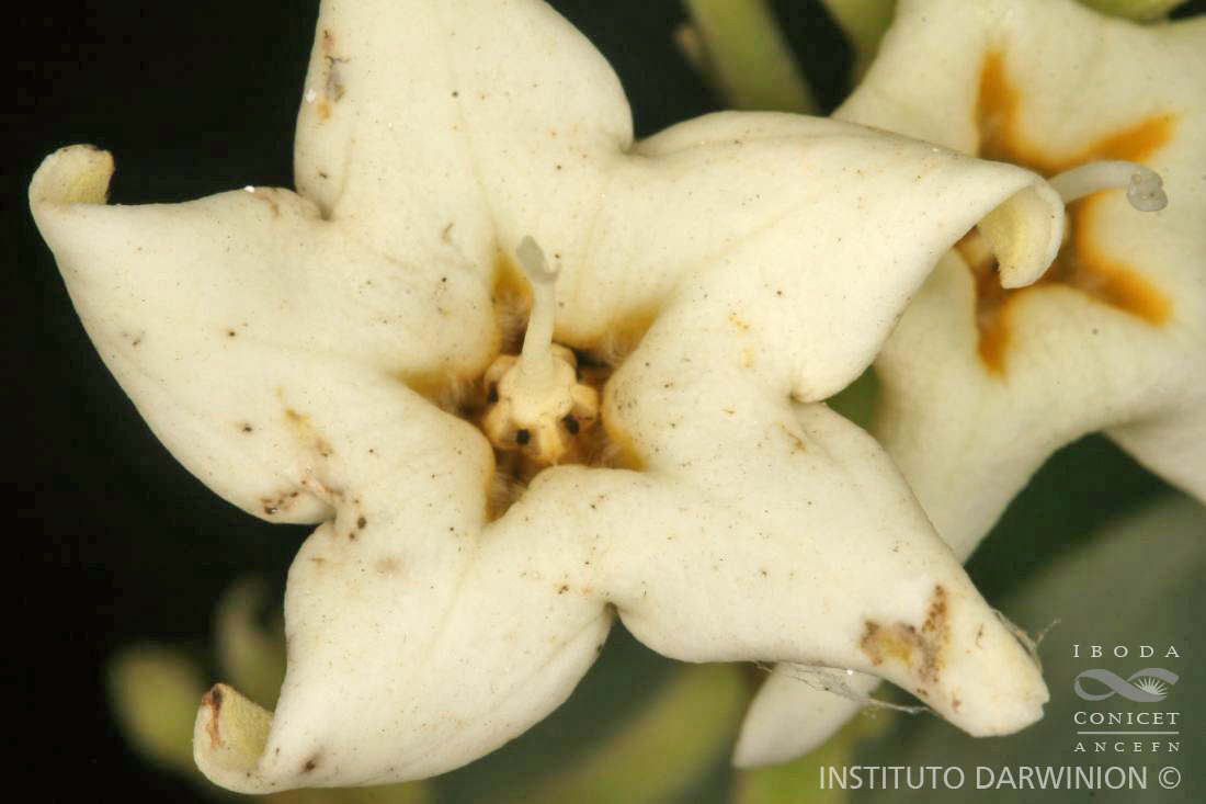 Voluble, de 4-5 m de alto, con ramas albido-tomentosas, cubiertas de largos tricomas. Hojas con pecíolo de 3-5 cm de largo, pubescente; lámina ovada, de 3-14 × 2-8 cm, con base cordada, ápice acuminado, cara adaxial verde-grisácea, cara abaxial con tricomas cortos abundantes y tricomas largos lanosos, discoloras. Inflorescencias corimbiformes o umbeliformes, con 3-13 flores, con pedúnculo de 5-6 cm de largo, tomentoso. Flores con pedicelo de 2 mm de largo, tomentoso; cáliz con lóbulos lanceolados, de 8-9 × 1,5 mm, acuminados, pubescentes; corola blanca o amarilla, con tubo campanulado, de 5 mm de largo, externamente pubescente, internamente barbado, con lóbulos subtriangulares, de 10 × 5 mm, glabros; ginostegio sésil, de 4 mm de alto; anteras de 3 mm de largo, de base sagitada-auriculada, membrana apical obovada, de 1 mm de largo; apéndice de la cabeza estilar filiforme de 3-5 mm de largo, 2-furcado en el ápice; polinario con el retináculo de contorno oblongo, de 0,8-0,9 × 0,2-0,3 mm, caudículas horizontales de 0,2 mm de largo, polinios elipsoides, de 0,6 × 0,3 mm. Folículos ovoide-alargados, de 11 × 4 cm, con los extremos truncados, superficie aterciopelada. Semillas con penacho de pelos blancos.
