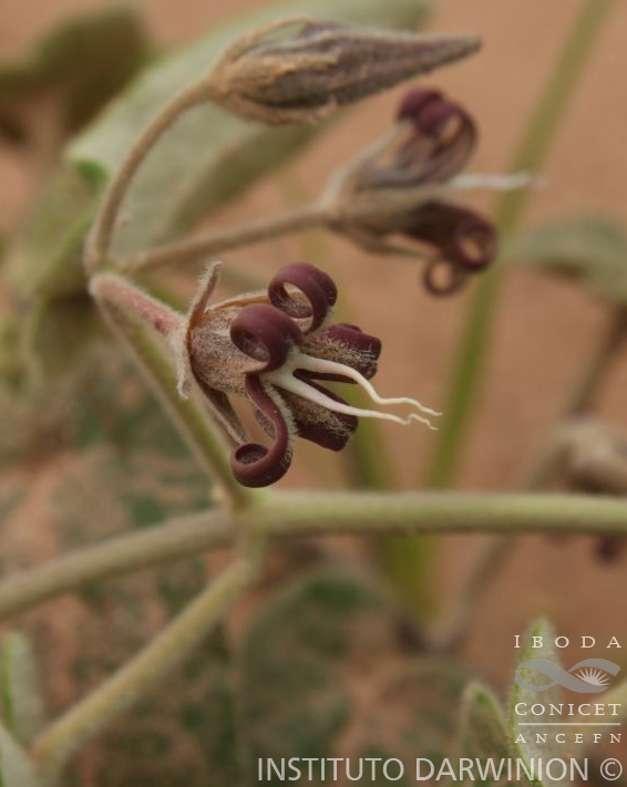 Subarbusto, ramas con el ápice voluble. Hojas con pecíolo de 1,5-2 cm de largo, pubescente; lámina ovado-triangular, de 6-8 × 2-3,5 cm, la base cordada, ápice largamente acuminado, cara abaxial albo-lanosa, cara adaxial pubescente, discoloras. Inflorescencias umbeliformes, con 1-10 flores, con pedúnculo de 1-4 cm de largo, lanoso. Flores con pedicelo de 0,8-1 cm de largo, sublanosos; cáliz con lóbulos angostamente lanceolados, de 5-6 × 1,5 mm, cara abaxial pubescente, cara adaxial lanosa; corola atropurpúrea, con tubo angostamente campanulado, de 4 × 5 mm, superficie externa pubescente, superficie interna barbada hacia el ápice, con lóbulos angostamente lanceolados, de 9 × 2,5 mm, algo retorcidos, cara abaxial pubescente, cara adaxial barbada en la base; ginostegio con estípite de 1 mm de largo; anteras de 1,5 mm de largo, con membrana apical orbicular, de 1,4 mm de largo; cabeza estilar con apéndice 2-fido desde el tercio basal, segmentos filiformes, ca. 9 mm de largo, arqueados, conniventes en el ápice; polinario con retináculo oblongo-obovoide, de 0,5 × 0,3 mm, algo aplanado, caudículas oblicuas a subhorizontales, de 0,3 mm de largo, polinios ovoides, de 0,6 × 0,35 mm. Folículos ovoideo-alargados, de 7 × 1,5 cm, superficie aterciopelada. Semillas numerosas, obovoides, de 4-5 × 2,5 mm, negras, con un penacho de pelos ca. 2 cm de largo.