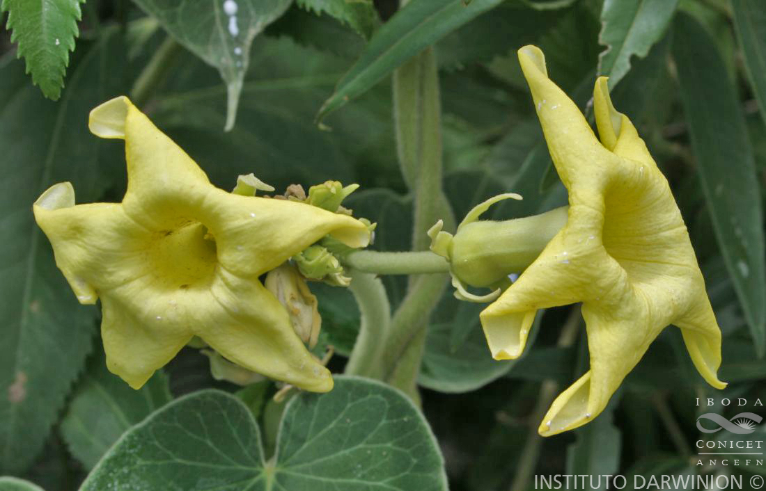 Voluble de varios metros de alto, ramificada, con ramas con pubescencia amarillenta, aterciopelada. Hojas con pecíolo de 4-5 cm de largo, tomentoso; lámina ovada, de 12-15 × 8-10 cm, la base cordada, ápice largamente acuminado, cara adaxial verde grisácea, con tricomas esparcidos, cortos, cara abaxial albo-tomentosa, aterciopelada, discoloras. Inflorescencias corimbiformes, con 8-15 flores, con pedúnculo hasta de 15 cm de largo, tomentoso. Flores con pedicelo de 1,3-1,5 cm de largo, tomentoso; cáliz con lóbulos linear-lanceolados, de 10-13 × 3 mm, cara abaxial tomentosa, cara adaxial pubescente; corola amarillo-limón, tubo de 2,5-3 × 1-1,5 cm, externamente tomentoso, internamente glabro, lóbulos subtriangulares, de 1,5-1,8 × 1-1,2 cm, cara abaxial tomentosa, cara adaxial glabra; corona ginostegial ausente; ginostegio subsésil, de 6 mm de alto; anteras sagitado-auriculadas, de 4 mm de largo, la membrana apical ovado-oblonga, de 2,5 mm de largo, de ápice obtuso; apéndice de la cabeza estilar grueso, cónico, de 3 mm de alto, brevemente 2-furcado en el ápice; polinario con retináculo linear-lanceolado, de 3 × 0,5 mm, caudículas horizontales de 0,25 mm de largo, algo aplanadas, polinios ovoide-oblongos, de 1,4 × 0,4 mm. Folículos de contorno oblongo-alargado de 11 × 3,5 mm, de ápice atenuado, superficie aterciopelada. Semillas obovoides, de 5 × 3 mm, superficie rugosa, parda.