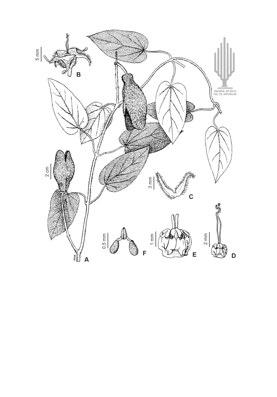 Voluble de varios metros de alto, con las ramas vilosas. Hojas con el pecíolo de 4-6 cm de largo, viloso; lámina triangular-ovada a elíptica, de 5-11 × 2-9 cm, de base cordada, ápice acuminado, cara abaxial blanco-lanosa, cara adaxial verde-claro y con tricomas esparcidos. Inflorescencias umbeliformes, plurifloras, con pedúnculo de 4-5 cm de largo, viloso. Flores con pedicelo de 0,8-1 cm, viloso; cáliz con los lóbulos linear-lanceolados, de 4-5 × 0,8 mm, viloso en ambas caras, coléteres presentes debajo del seno interno; corola con tubo campanulado-urceolado, de 3 × 3 mm, cara externa tomentosa, cara interna barbada hacia el ápice, con lóbulos reflexos, de 8 × 2,5 mm, cara abaxial tomentosa, cara adaxial barbada; corona ginostegial ausente; ginostegio subsésil, de 2 mm de alto; anteras de 1 mm de largo, la membrana apical obovada, de 0,6 mm de largo; apéndice de la cabeza estilar 2-fido, filiforme, de 7 mm de largo; polinario con retináculo ovoide, de 0,40-0,47 × 0,20-0,25 mm, caudículas levemente descendentes, de 0,07-0,12 mm de largo, polinios piriformes, de 0,45-0,50 × 0,20-0,25 mm. Folículo ovoide, de 5,3-7 × 1,9-2,5 cm, de base y ápice abruptamente estrecho, superficie acanalada, lanosa. Semillas más de 50 por folículo, con un penacho de pelos de 1,3-1,6 cm de largo.