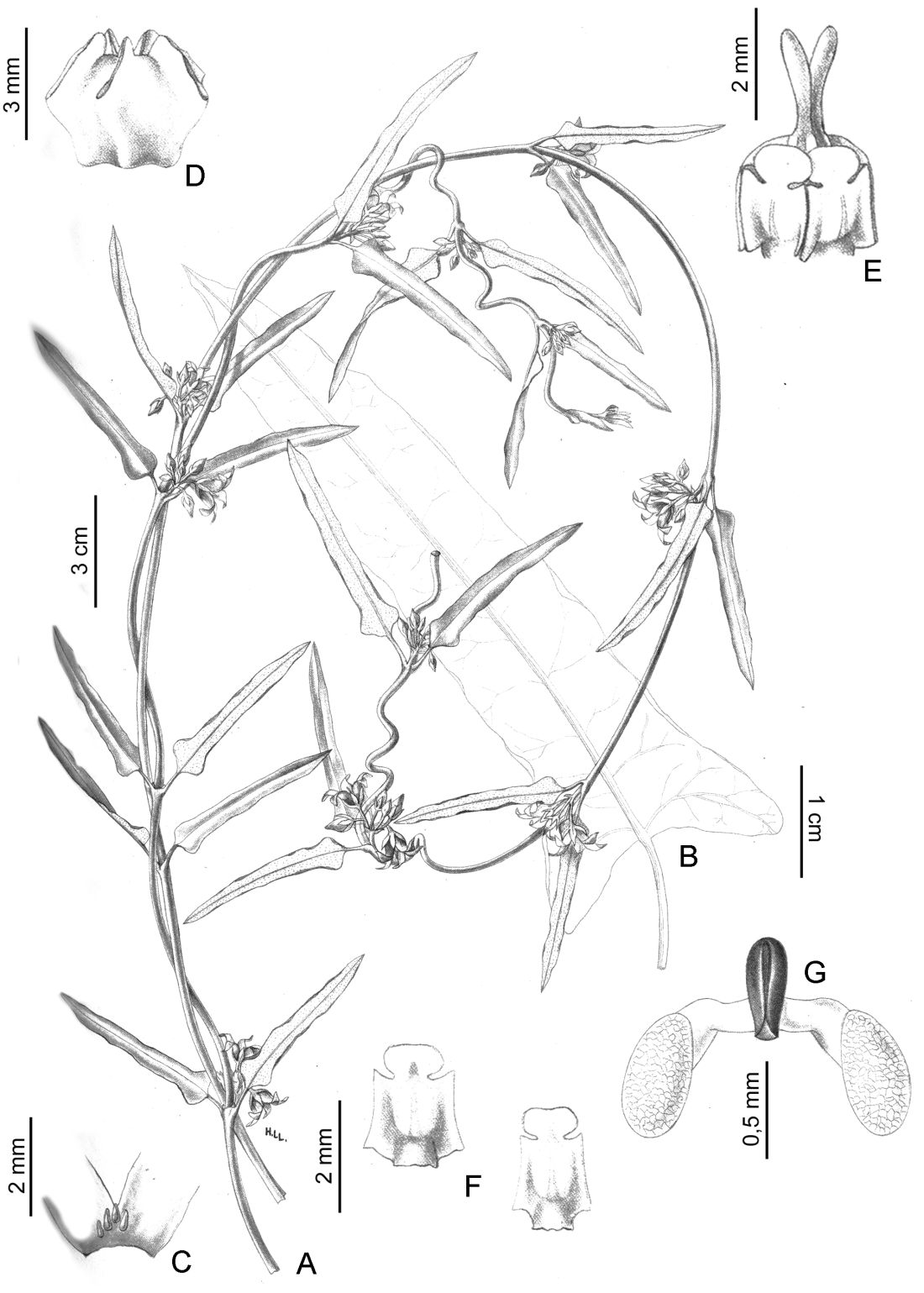 A. Rama florífera. B. Hoja basal. C. Coléteres en el cáliz. D. Corona. E. Ginostegio. F. Antera. G. Polinario. Tomado de Gen. Sp. Pl. Argent. 2: lámina 95. 1944.
