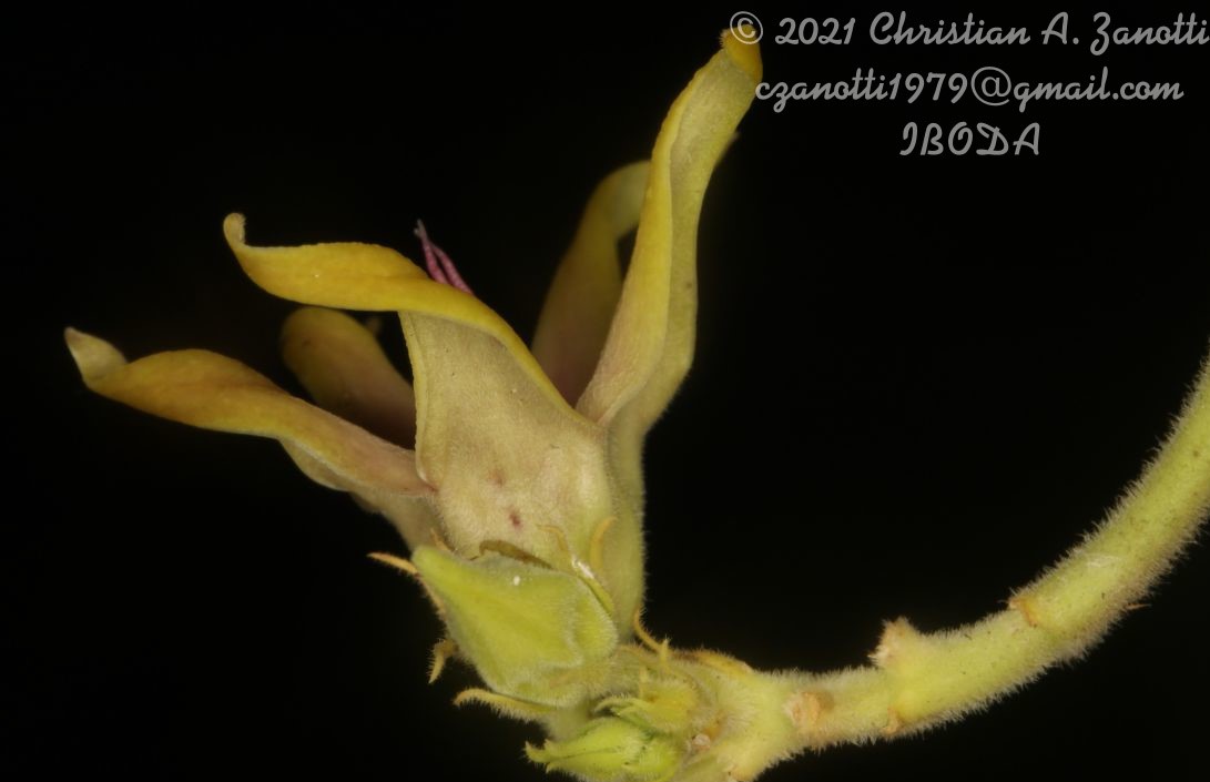 Voluble hasta de 10 m de alto, ramas pubescentes, tomentosas a vilosas. Hojas con pecíolo de 1-4 cm de largo, pubescente; lámina oblonga, ovado-lanceolada, ovada, de 3-13 × 2-5 cm, ápice largamente acuminado, base cordada, cara abaxial tomentosa, cara adaxial laxamente pubescente con notables venas blanquecinas a liláceas, discoloras. Inflorescencias corimbiformes, extraaxilares, alternas, con 1-11 flores, pedúnculo de 0,7-4,3 cm de largo, tomentoso. Flores con pedicelo de 0,4-2 cm de largo, finamente pubescente; cáliz partido casi hasta la base, lóbulos linear-lanceolados, de 4,5-11 × 0,5-1,2 mm, externamente pubescentes; corola con el tubo campanulado de 4-7 mm de largo, externamente pubescente, internamente glabrescente, lóbulos linear-lanceolados, de 11-24 × 2,5-4 mm, erectos a patentes, cara externa pubescente, cara interna glabra, verde-amarillenta a amarillo-rojiza; corona, con lóbulos espatuliformes, de 2,5-3 × 2 mm, ápice truncado, redondeado, margen revoluto, cara interna con 2 protuberancias carnosas, crema; ginostegio sésil con apéndice de la cabeza estilar de 0,8-1,1 cm de largo, vináceo, con frecuencia ruminado, 2-fido hacia el ápice; anteras subquandrangulares, de 0,5-1 mm de largo, membrana apical cordiforme; polinario con el retináculo sublinear, de 0,84-0,92 × 0,1-0,12 mm, con apéndice traslúcido suborbicular, de 0,5 × 0,2 mm, caudículas de 0,24-0,34 mm, horizontales, con diente lateral curvo, polinios oblongos de 0,56-0,66 × 0,14-0,16 mm. Folículos simples, raro geminados, de 6-12 × 1-1,5 cm, pubescentes. Semillas más de 200 por fruto, obovadas, marginadas, de ápice dentado, verrucosa, pardas.