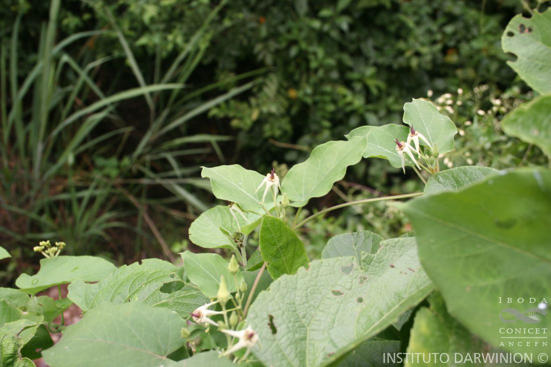 Voluble hasta de 3 m de alto, con ramas pubescentes. Hojas con pecíolo de 2-4 cm de largo, pubescente; lámina ovada, de 3,5-6 × 2-5,5 cm, ápice acuminado, base cordada, cara abaxial tomentosa, cara adaxial pubescente, con coléteres en la base de la vena media. Inflorescencias paucifloras, extraaxilares, alternas, pedúnculo de 2,5-4,1 cm de largo, tomentoso. Flores con pedicelo de 0,8-2 cm de largo, tomentoso; cáliz con lóbulos lanceolados, de 4-5 × 0,8-1 mm, externamente pubescentes, cara interna glabra con coléteres en el seno; corola con tubo campanulado, verde-amarillenta, lóbulos linear-lanceolados, de 7-11 × 1,5-2 mm, reflexos retorcidos en el tercio distal, revolutos, cara externa pubescente, cara interna glabra; corona con lóbulos flabeliformes, de 2,5-3 × 2,5 mm, ápice truncado, levemente retuso, base ensanchada, verde-amarillentos y en la base, violácea; ginostegio subsésil; con apéndice de la cabeza estilar de 7 mm de largo, 2-fido hasta la porción media, ramas cónicas levemente incurvas, violáceo, craso; anteras cuadrangulares, de 1-1,3 mm de largo, membrana apical oblongo-ovada; polinarios con el retináculo subclaviforme, de 1,04-1,3 × 0,1-0,26 mm, caudículas de 0,24-0,3 mm, horizontales, con diente lateral curvo, polinios de cortono oblongo, de 0,68-0,76 × 0,14-0,2 mm. Folículos, de 6-9 × 2,5-3 cm, con frecuencia geminados, rectos o algo incurvos en la parte apical, glabros. Semillas 61-120 por fruto, obovadas, marginadas, de ápice dentado, verrucosas, pardas.