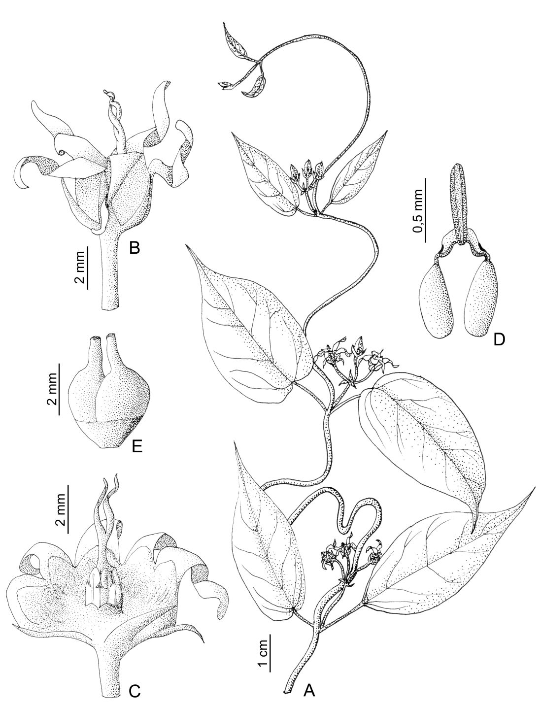 Voluble de 4-5 m de alto, con ramas pubescentes a tomentosas. Hojas con pecíolo de 2-3,5 cm de largo, tomentoso; lámina ovado-lanceolada a elíptica, de 9-12 × 3-7 cm, ápice largamente acuminado, base subcordada, cara abaxial con pubescencia densa, especialmente sobre las nervaduras, cara adaxial glabrescente, con tricomas cortos, esparcidos, discoloras. Inflorescencias umbeliformes, extraaxilares, alternas, con 2-15 flores, pedúnculo de 1-2 cm de largo, pubescente. Flores con pedicelo rojizo de 0,5-0,8 cm de largo, pubescente; cáliz con lóbulos linear-lanceolados, de 4-4,1 × 0,5-0,9 mm, ápice recurvo, cara abaxial tomentosa, cara adaxial glabra a escasamente pubescente, con coléteres en el seno; corola con tubo urceolado de 4 mm de largo, cara externa rojiza, pubescente, cara interna barbada, lóbulos angostamente lanceolados, de 6 × 1,5 mm, retorcidos, cara adaxial glabra a excepción de la base que es barbada, cara abaxial pubescente; corona con lóbulos subcuadrangulares, de 1,5 mm de largo, ligeramente recurvados, con ápice trunco, incluidos en el tubo de la corola; ginostegio subsésil de 2 mm de largo, con apéndice de la cabeza estilar de 4 mm de largo, blanco, base cónica, luego furcado desde su parte media en dos segmentos filiformes, retorcidos en el ápice; anteras con membrana apical ovado-lanceolada, de 0,8 × 0,5-0,7 mm; polinarios con el retináculo lineal, de 0,6-0,7 × 0,12-mm, caudículas edentadas descendentes, ca. 0,3 mm de largo, polinios oval-oblongos, de 0,4-0,5 × 0,2-0,25 mm. Folículos oblongos, de 10-12 × 3-4 cm, simples, pubescentes. Semillas obovadas, verrucosas.